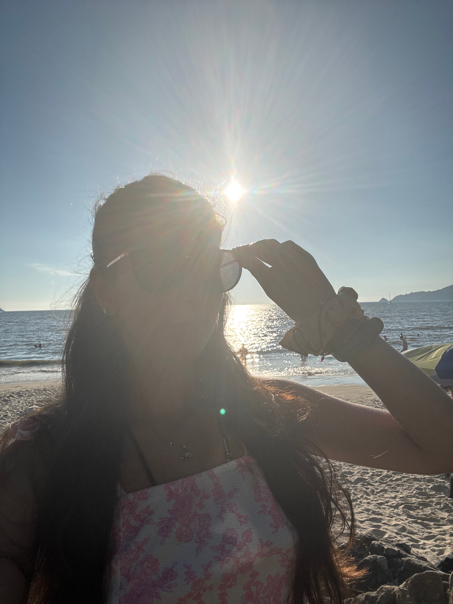 A sun-drenched, partially obscured view of a person at Patong Beach, Thailand. The person is holding sunglasses in their right hand, which is adorned with a scrunchie. They appear to be wearing a flor…read more