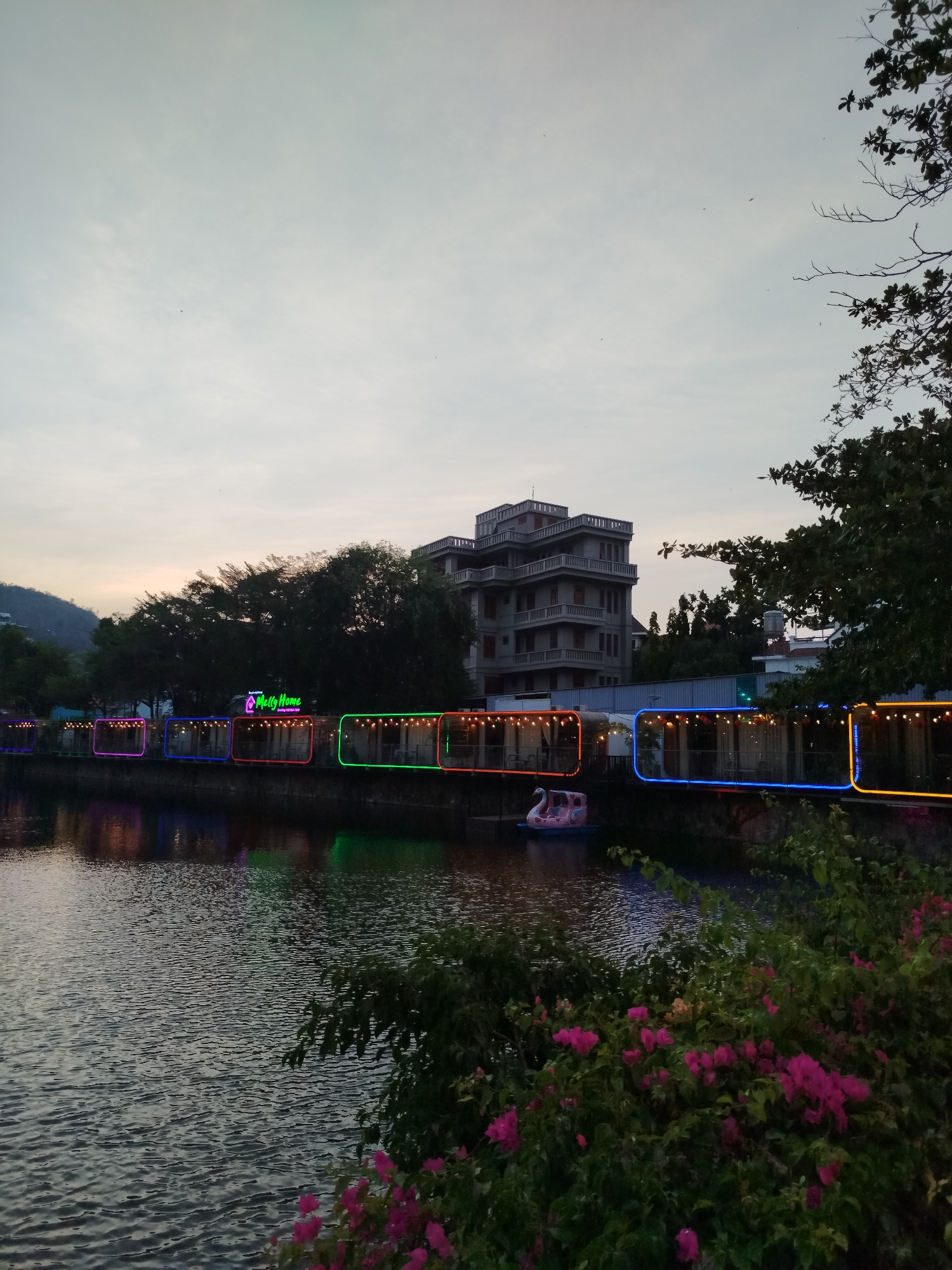The image depicts a waterfront scene in Ho Chi Minh City, Vietnam at dusk. A multi-story building stands in the background, near a row of structures along the water's edge. These structures have neon…read more