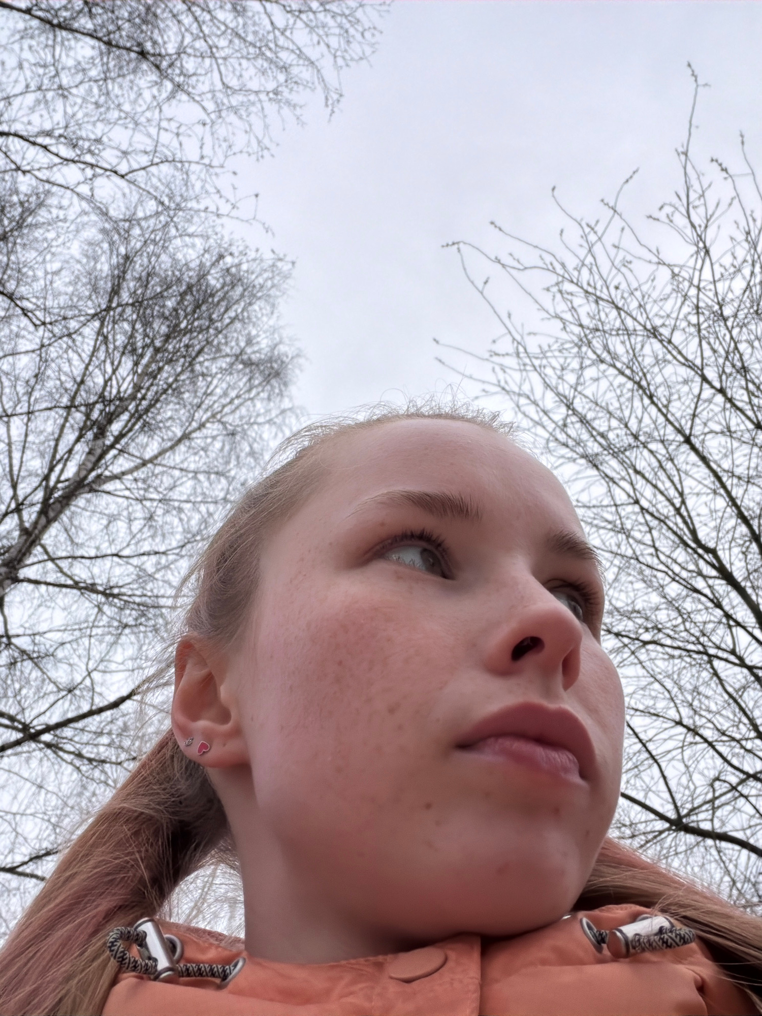 A low-angle, upward-facing photograph depicts a fair-skinned person with light blonde hair, presumably female, with freckles on her face. The person's face is oriented in such a way that the viewer is…read more