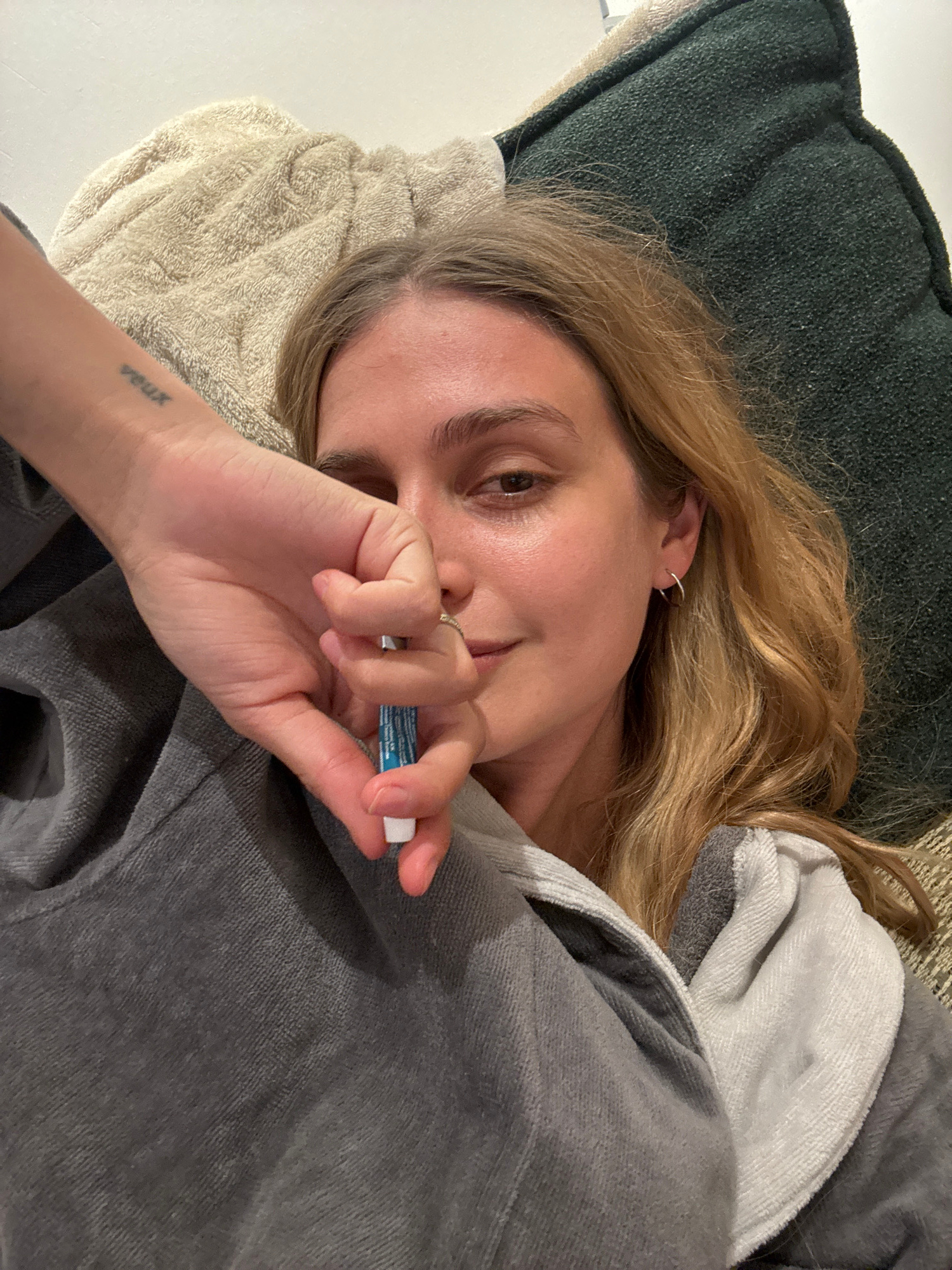 A person lies on cushions, covered by a grey robe with a white hood. The person holds a small, blue and white tube in their right hand. The person's hair is blonde and pulled back from their face. The…read more