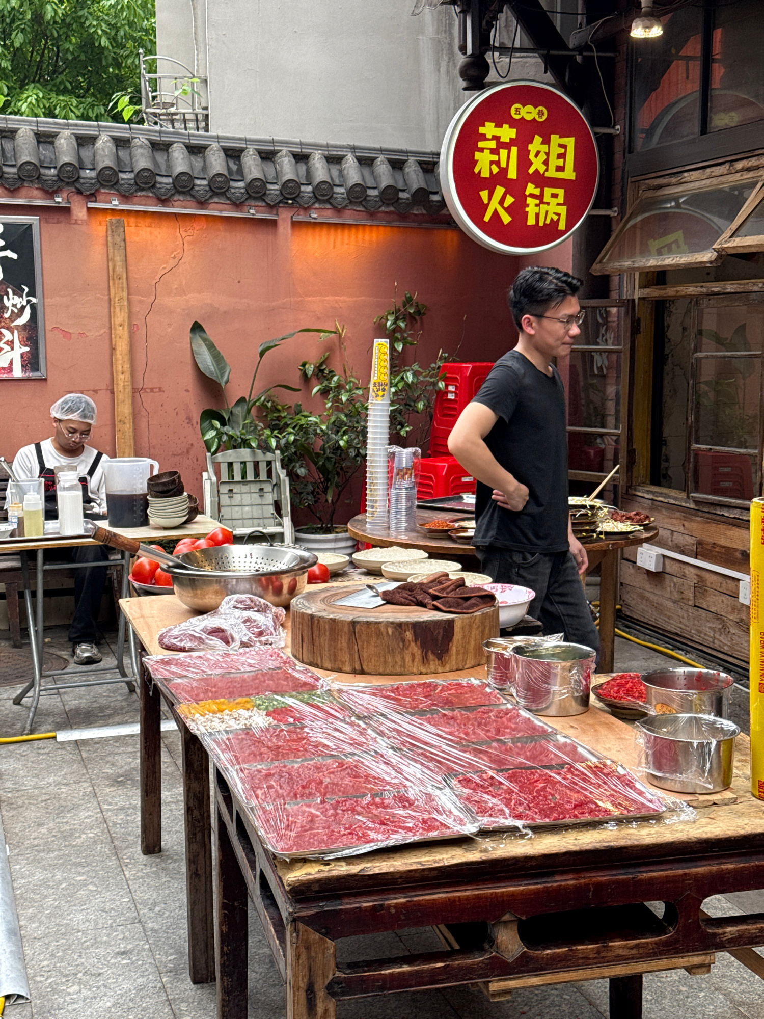 A street scene in Yuzhong District, China, shows a food stall with prepared food. A man in a black T-shirt and jeans is standing to the left of the stall, looking up at a red, round sign with Chinese…read more