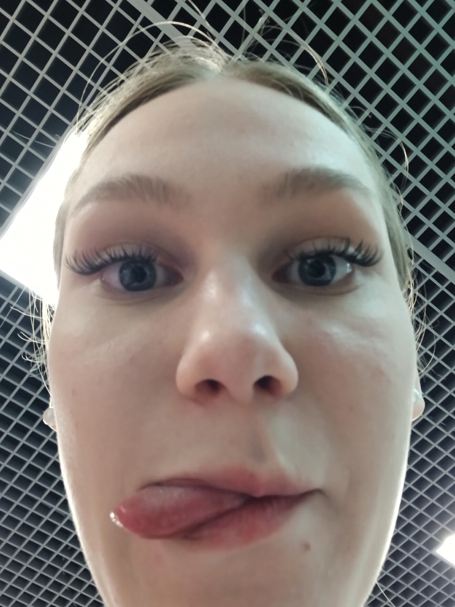 A close-up, low-angle portrait shows a young person with fair skin and light hair. The person has blue eyes with long eyelashes and their tongue is sticking out. The background consists of a grid-like…read more