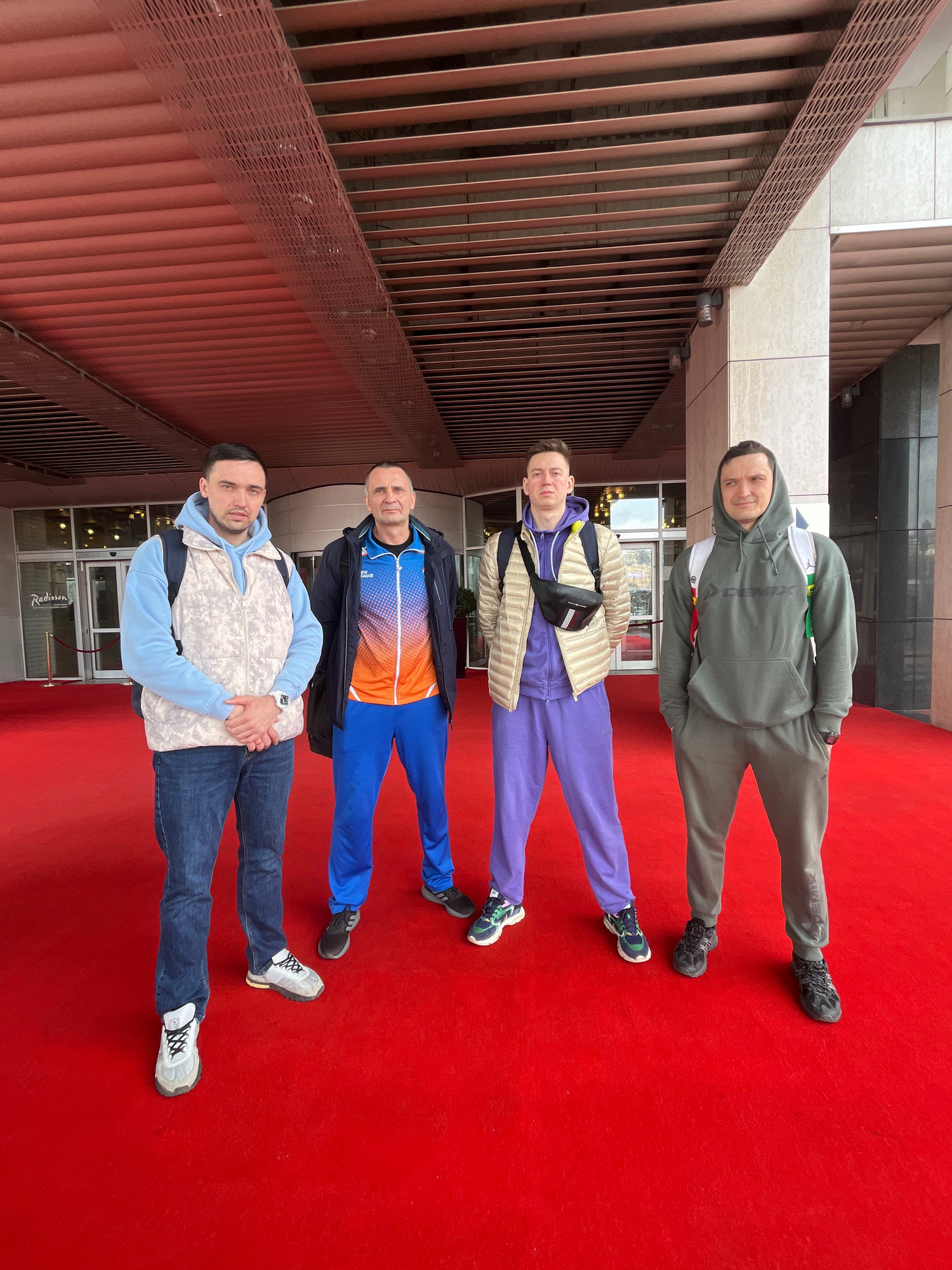 Four men are standing in a line on a red carpet in front of a building. The men are all dressed in casual clothing. The building has a modern design with red metal accents. The Radisson Hotel is visib…read more