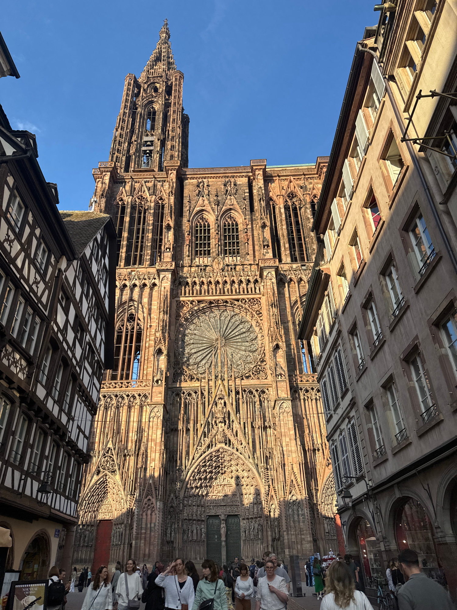 The image shows the Strasbourg Cathedral (Cathédrale Notre-Dame de Strasbourg), a significant landmark in Strasbourg, France. The cathedral's west facade, with its intricate stonework, rose window, an…read more