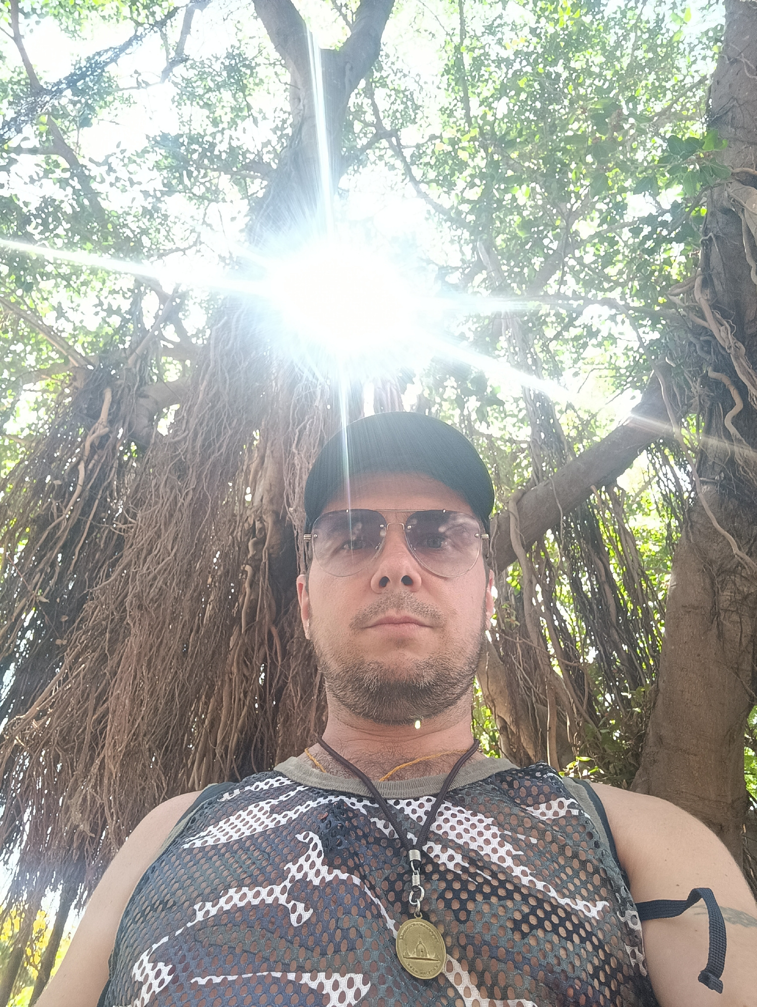 A close-up photograph captures a fair-skinned man with stubble and a cap standing beneath a tree. He is wearing aviator-style sunglasses, a camouflage-patterned sleeveless shirt, and a necklace with a…read more