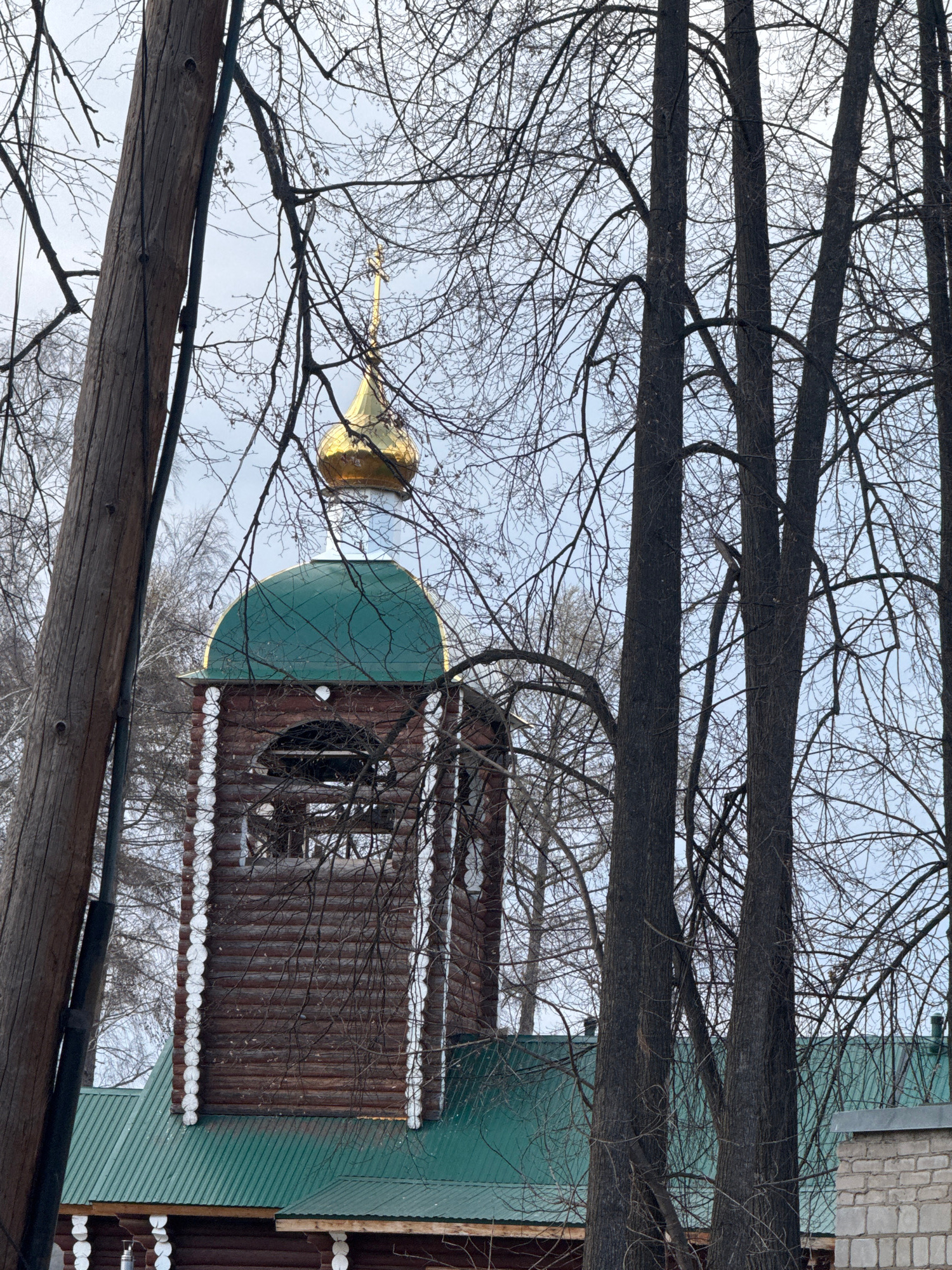 The image presents a winter scene in Chaikovsky, Russia, featuring a religious building partially visible through a dense network of bare tree branches. The building appears to be a church or chapel,…read more