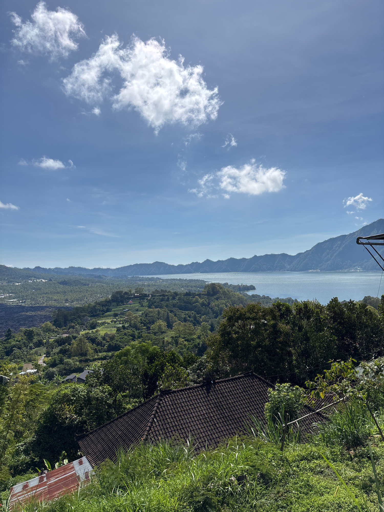 The image captures a scene in Kintamani, Indonesia. A distant mountain range is visible, with a body of water (likely Lake Batur) separating it from the foreground. The sky is blue with scattered whitβ¦read more