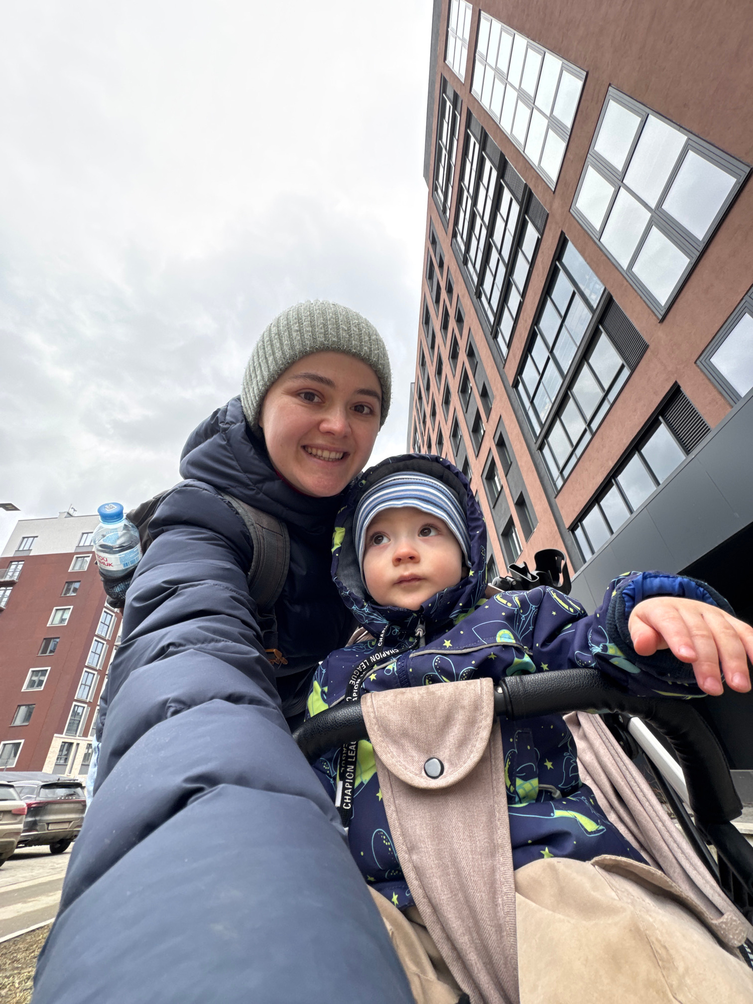 A woman in a gray knit hat and navy jacket smiles for a selfie with a baby in a blue astronaut-print snowsuit in a stroller. The photo is taken from a low angle looking up at a modern building with gr…read more