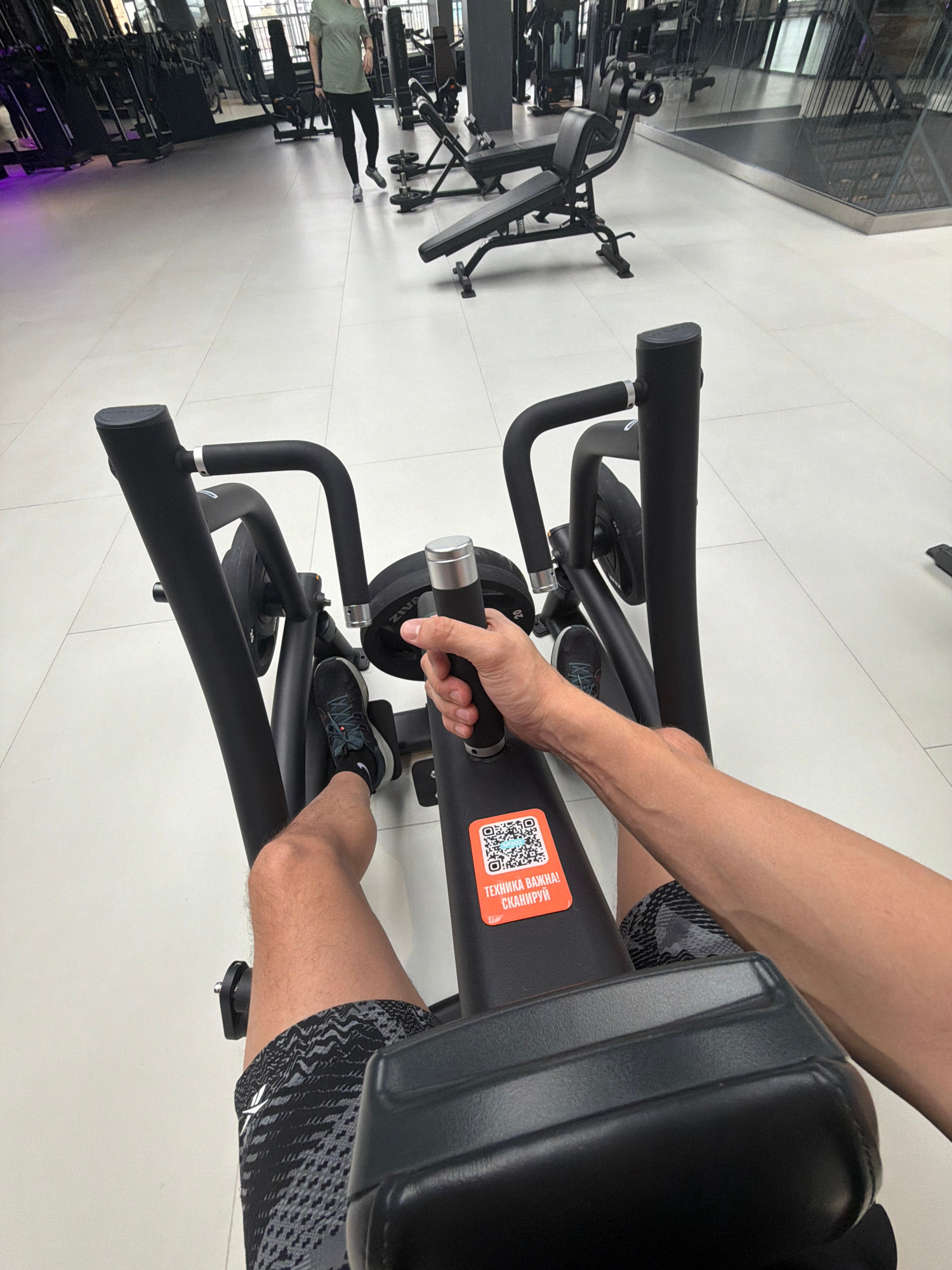 A person is using a weight machine in what appears to be a gym setting. The person is grasping the handle of the machine with their right hand. The lower part of their body is visible, wearing pattern…read more