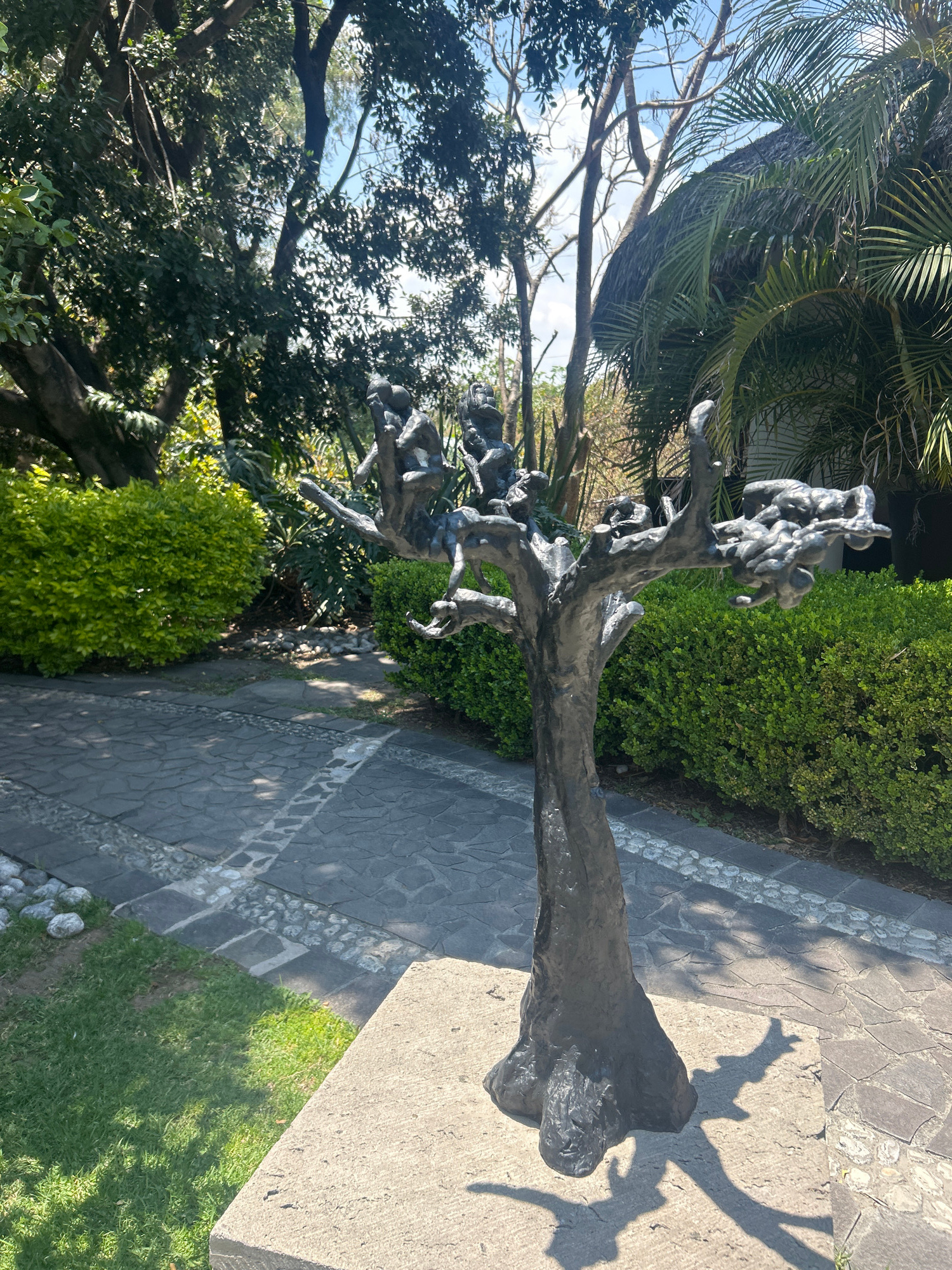 A metallic sculpture of figures in trees stands in Atlixco, Mexico. The sculpture is oriented horizontally in the image, appearing as a tree with human-like figures at its branches. The background con…read more