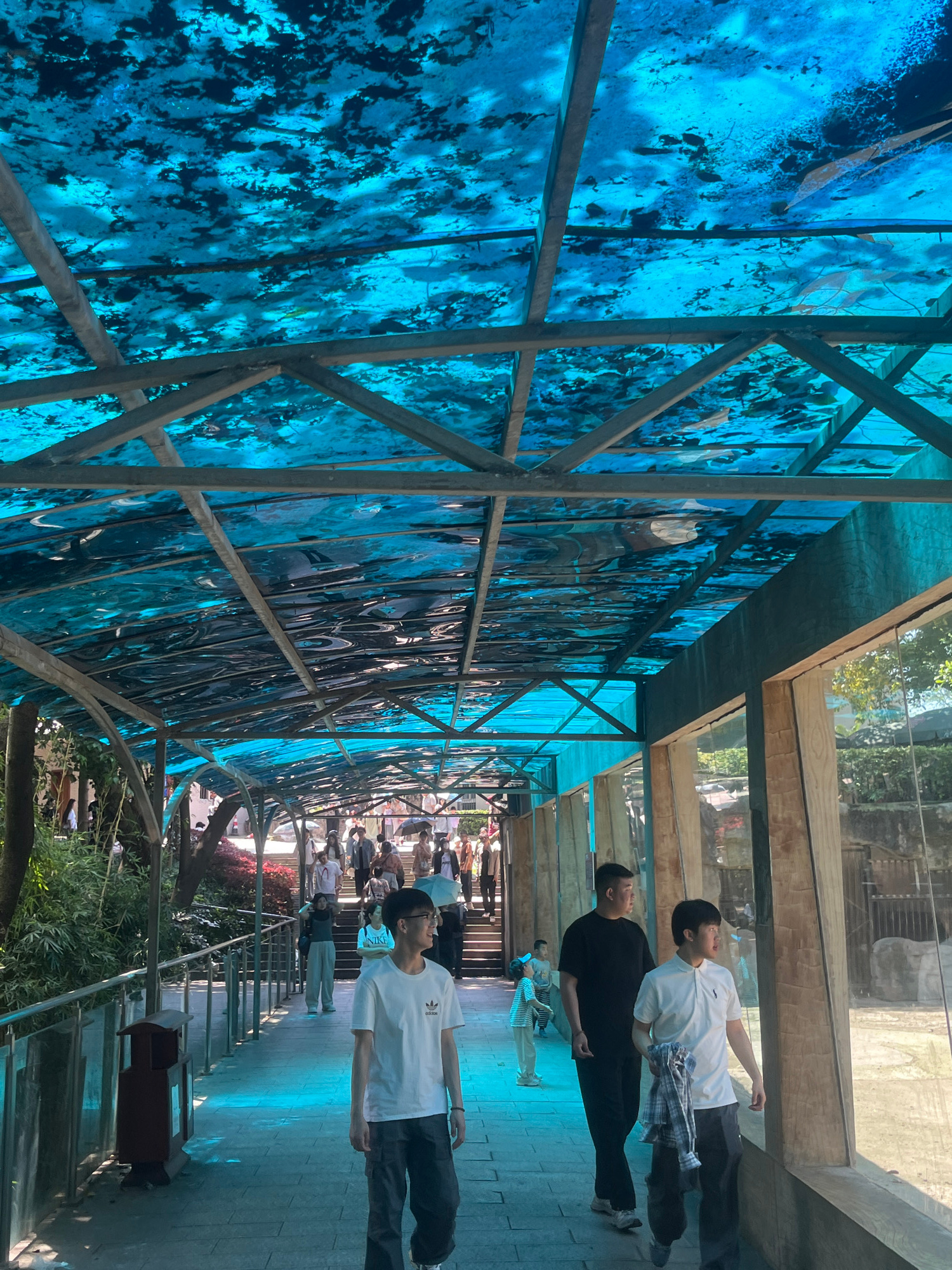 The image shows a partially covered walkway in Jiulongpo District, China. The walkway's roof and sides are constructed with a blue translucent material framed by a metal structure. The blue covering h…read more