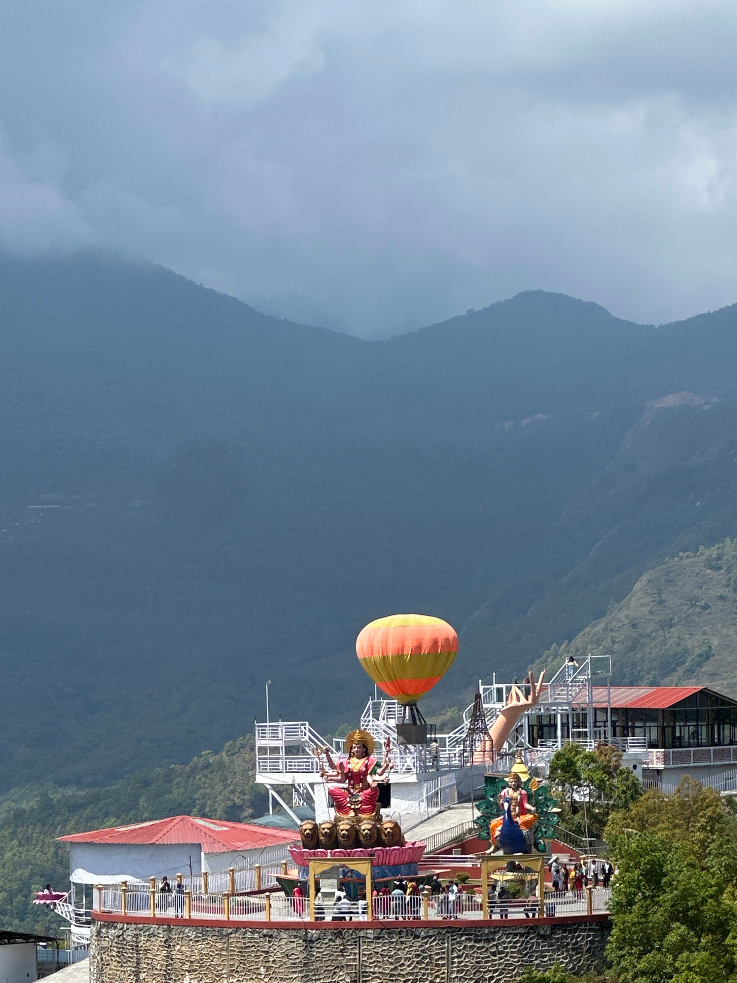 The image shows a tourist attraction situated on a hillside in what is presumably Pokhara, Nepal, as indicated by the mountainous backdrop. A structure, possibly a viewing platform or decorative insta…read more