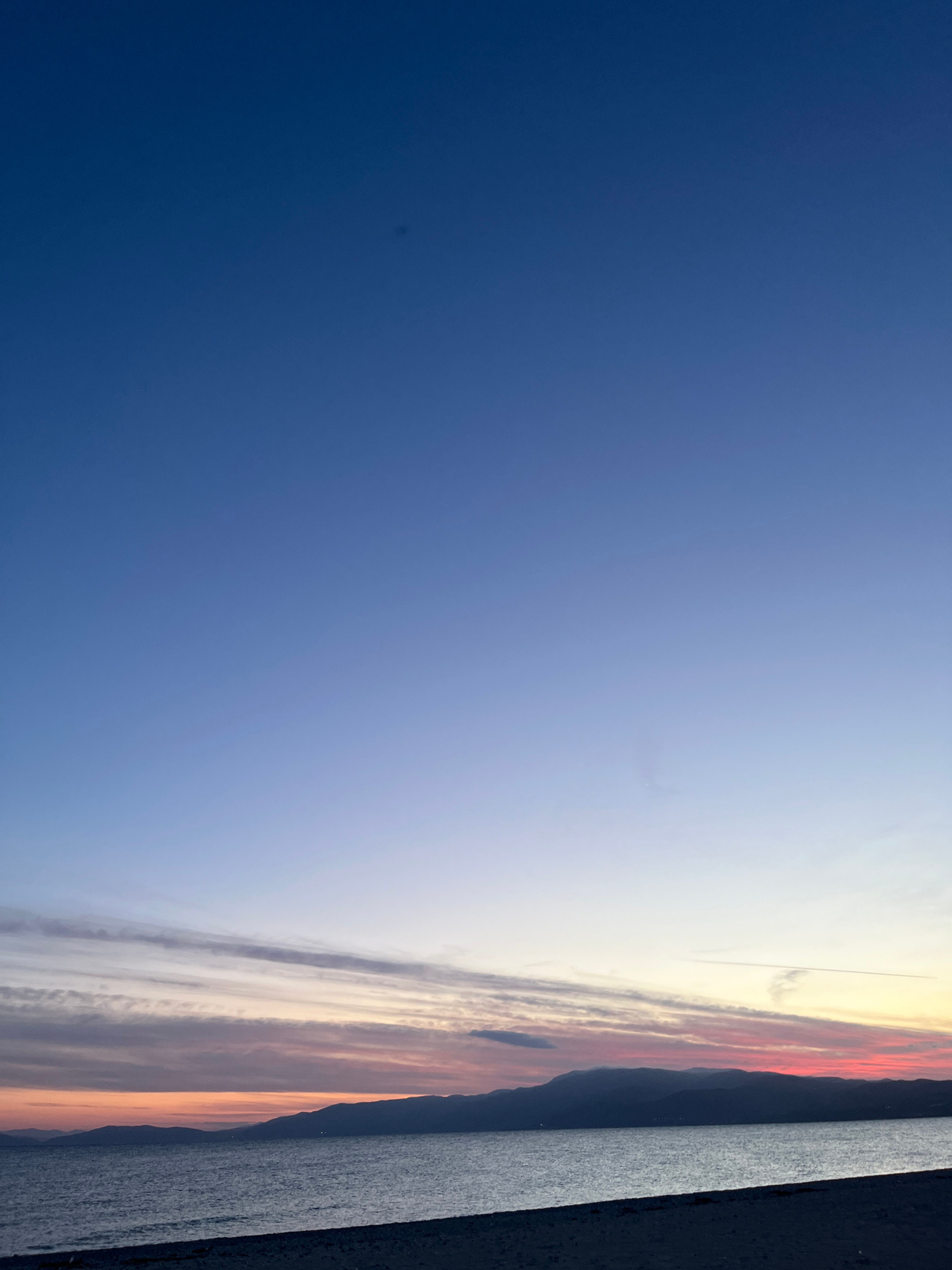 This photograph shows a sky at Ofrynio Beach, Greece, at either dawn or dusk. The left side of the image is a deep blue, gradually lightening towards the right where bands of white, gold, and pink sug…read more