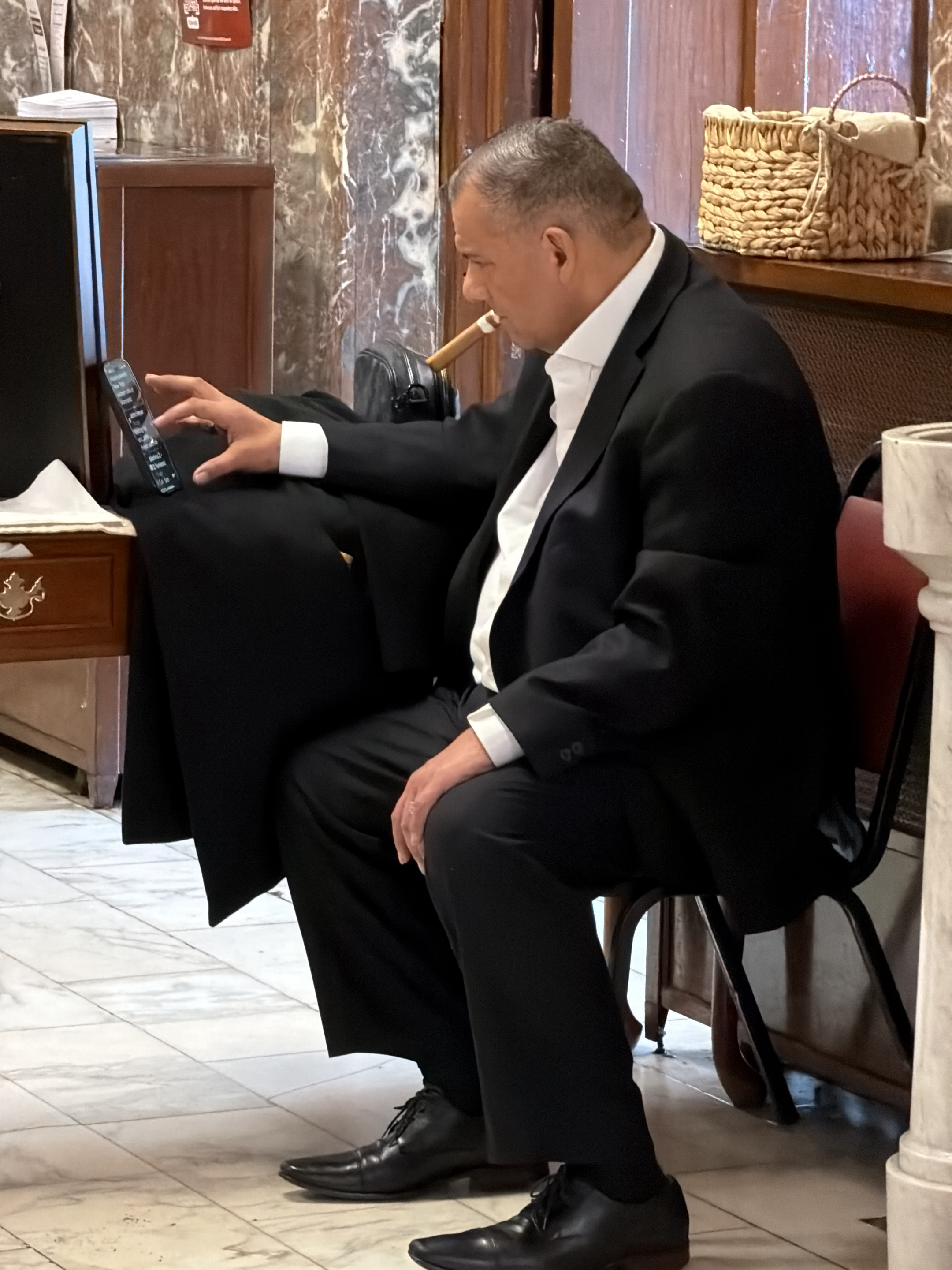 A man is seated indoors, dressed in a black suit and white shirt, with a black coat draped over the chair. He's holding a black electronic device in his left hand and appears to be smoking a cigar, wh…read more