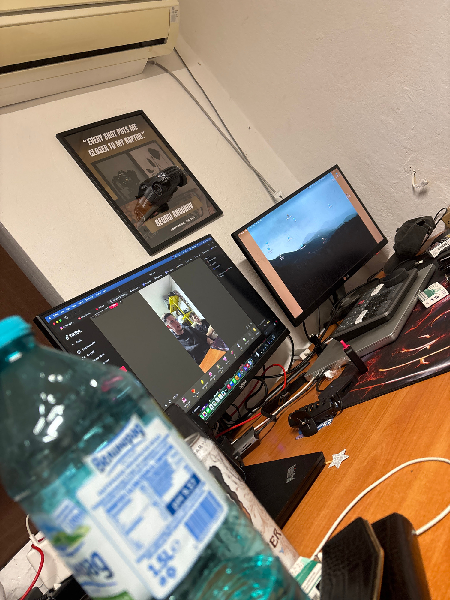 The image shows a workspace with two computer monitors, a laptop, and various accessories. One monitor displays a TikTok editing interface, while the other shows a landscape scene. A framed poster wit…read more