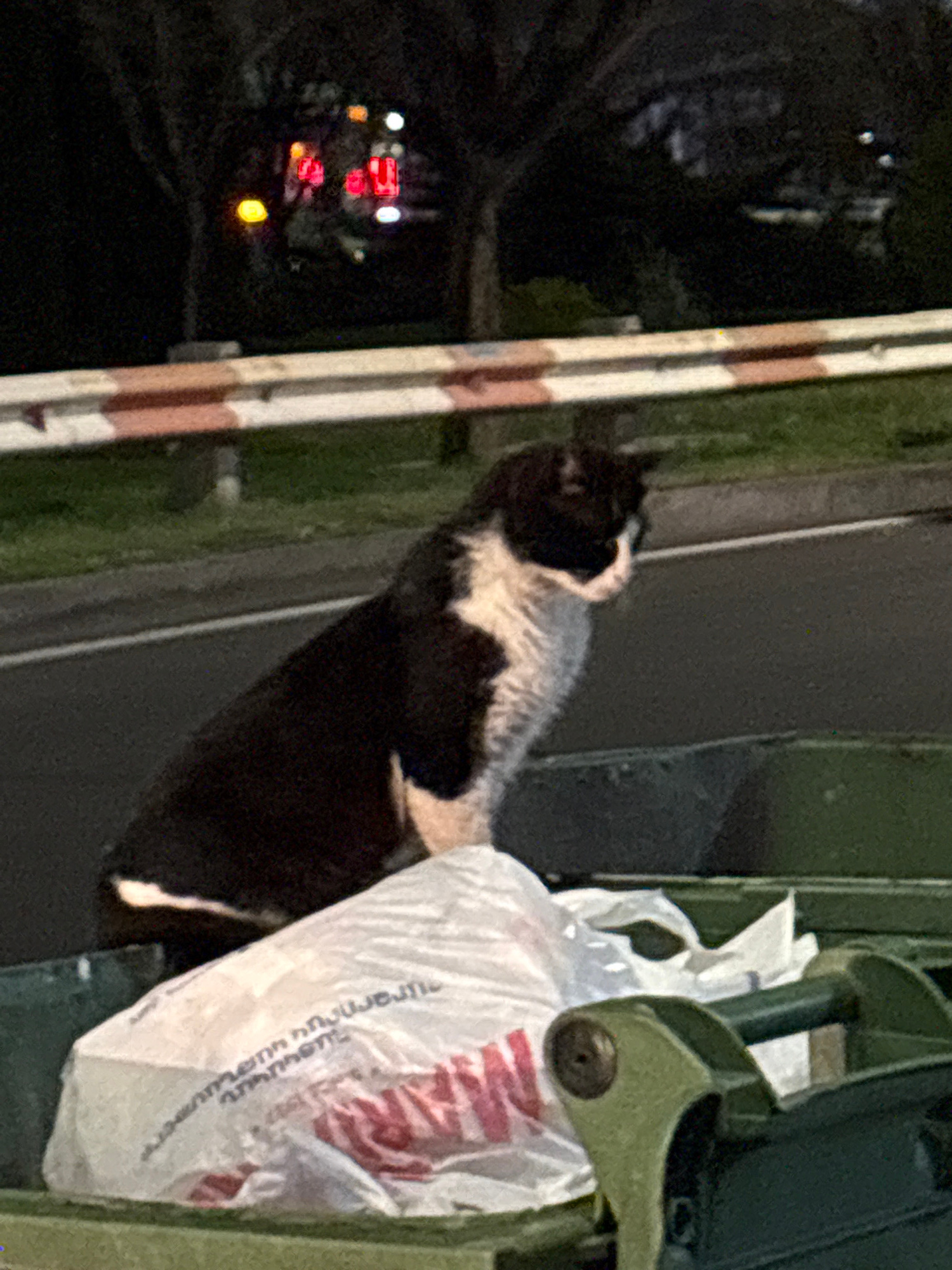 A black and white cat is perched on a metal structure, possibly a bridge or building scaffolding. The cat is next to a white plastic bag. Visible in the background is a street with lights, suggesting…read more