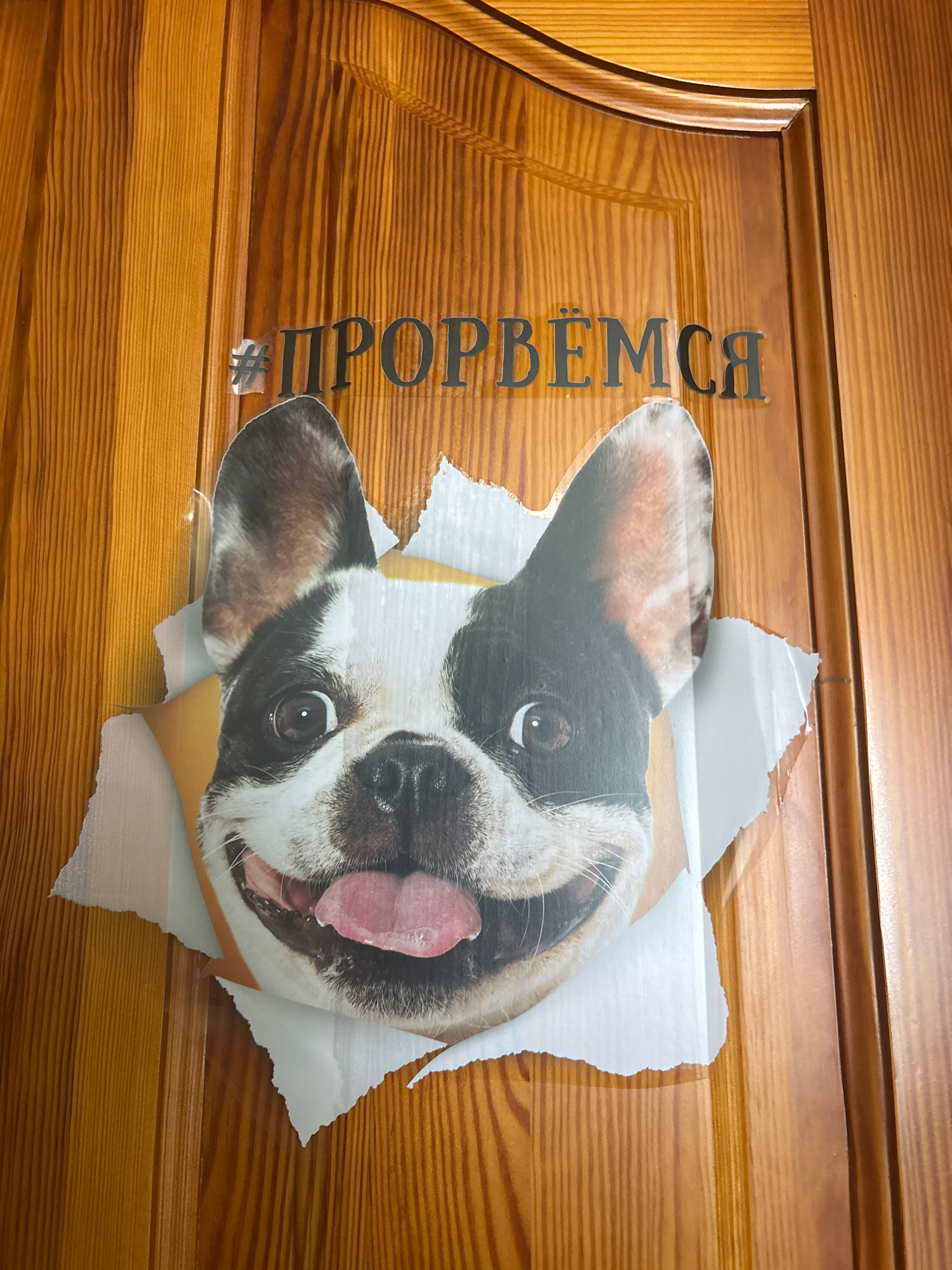 A wooden door is partially covered by a sticker of a dog's head emerging from a torn hole. The text "#ПРОВРЁМСЯ" is vertically printed on the left side of the door. The location is not evident in the…read more