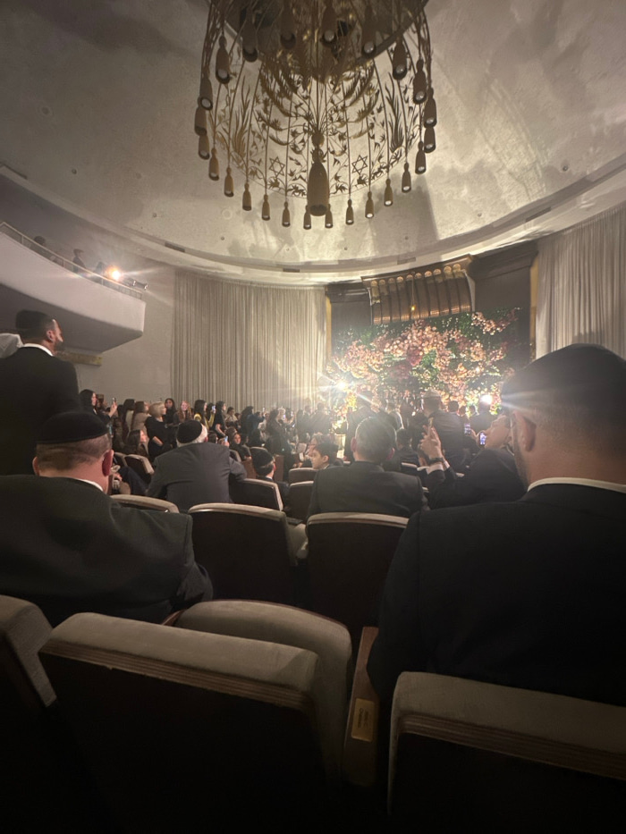 An audience is seated in rows of cushioned chairs, mostly facing forward. The people appear to be dressed in dark clothing, likely suits. A chandelier with ornate metalwork hangs from the ceiling. The…read more
