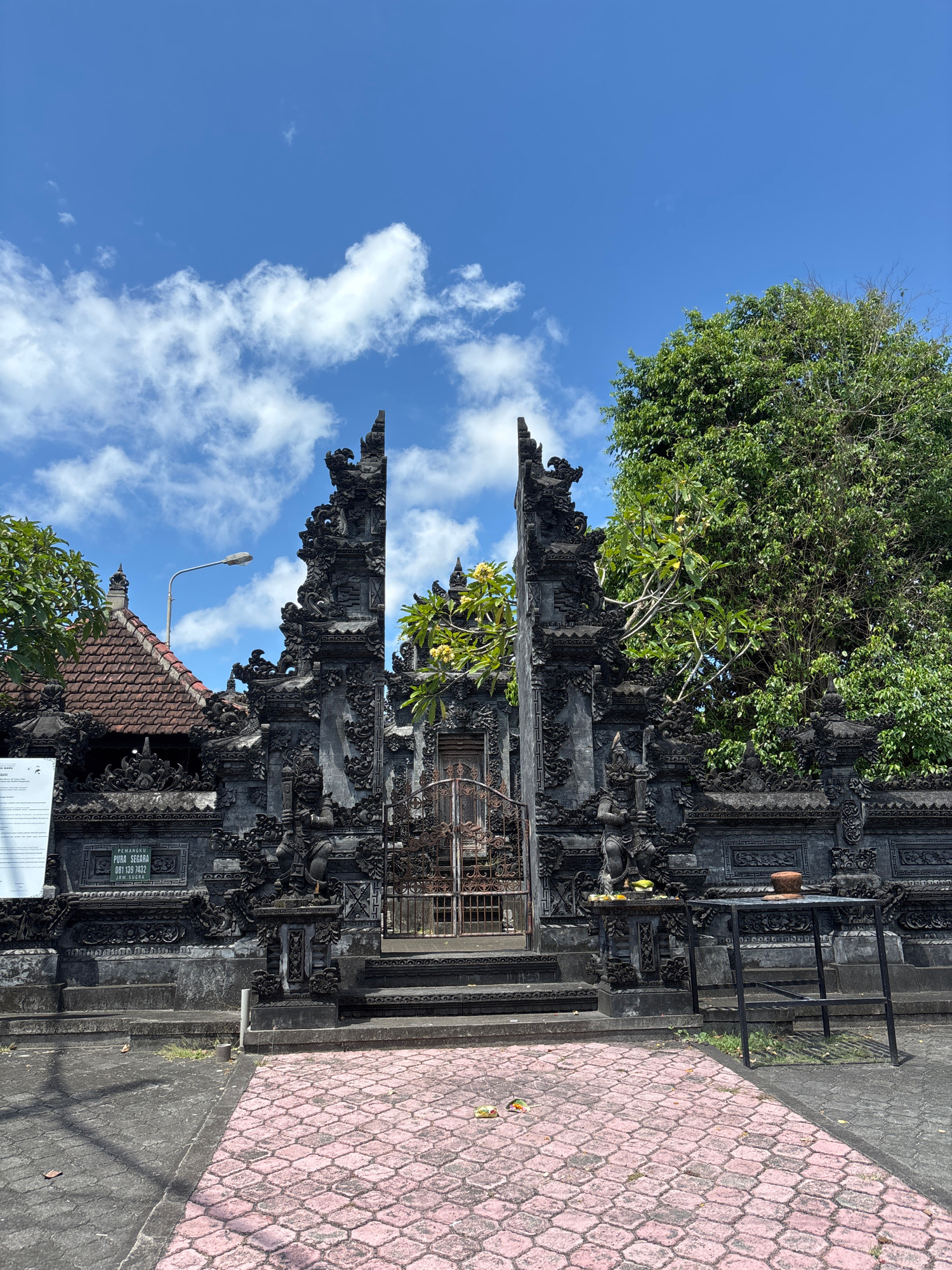 The image shows a traditional Balinese gate, known as a Candi Bentar, in Kuta Selatan, Indonesia. The gate is made of dark stone and features intricate carvings. The structure is surrounded by lush gr…read more
