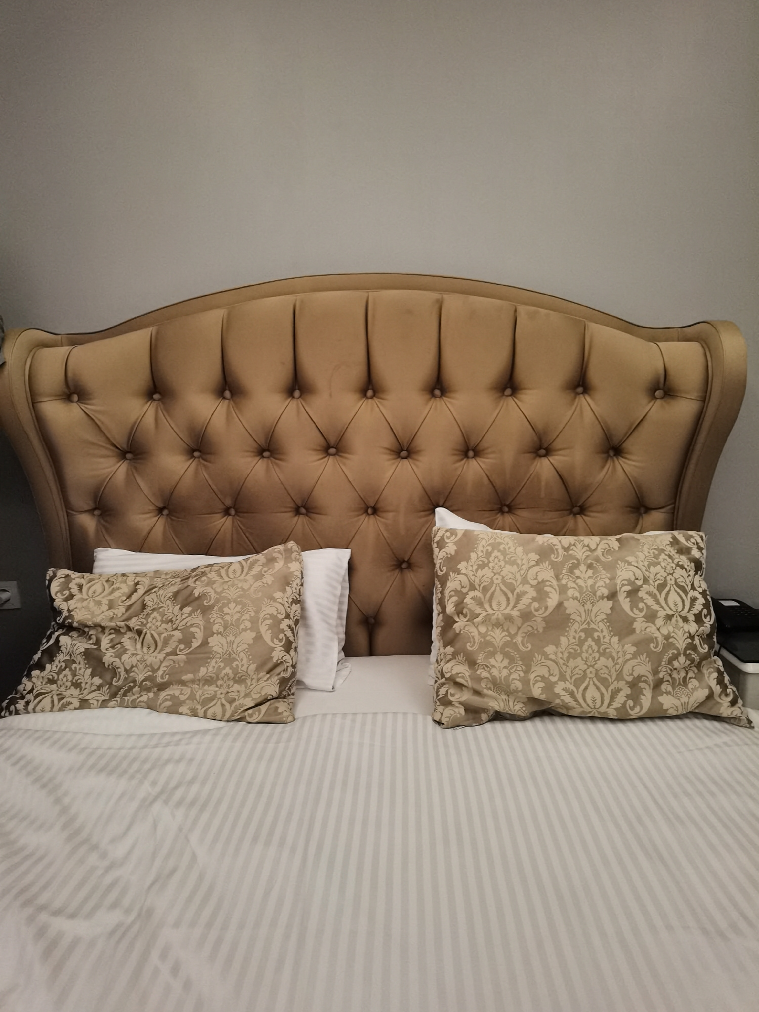 A close-up shot focuses on a made bed with a large, tufted, gold-colored headboard in a room with neutral-colored walls. Two large, square decorative pillows with a damask pattern are propped against…read more