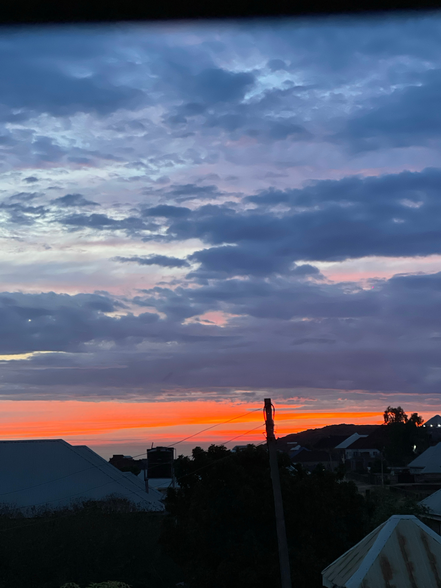 The image depicts a sunset with orange and purple hues, likely in the city of Jos, Nigeria, based on surrounding structures. The sky is filled with clouds. A utility pole and power lines are visible a…read more