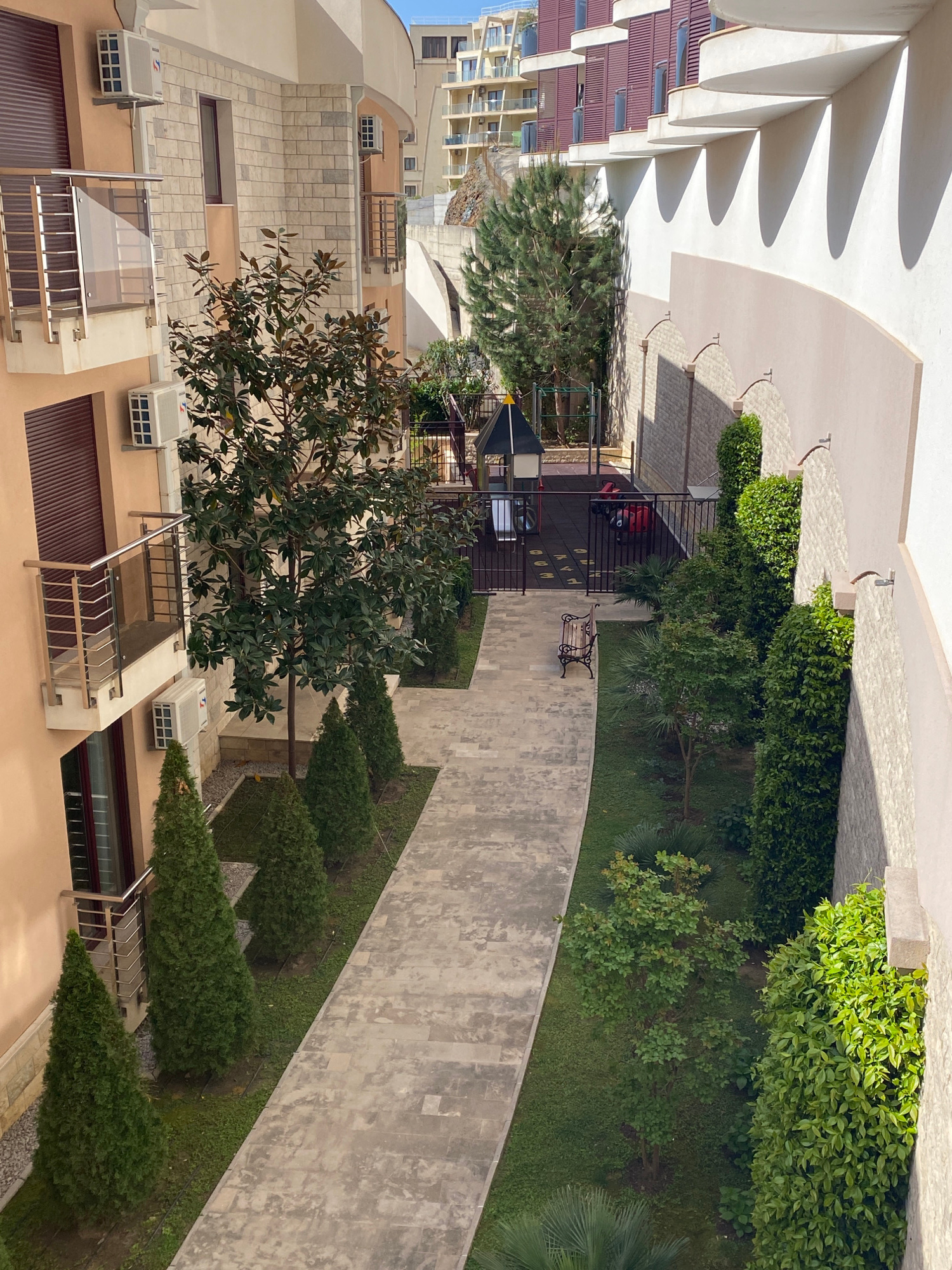 The image captures a peaceful, well-maintained outdoor courtyard or common area within a residential complex or resort in Boreti, Montenegro. The scene is illuminated by bright, sunny daylight, castin…read more