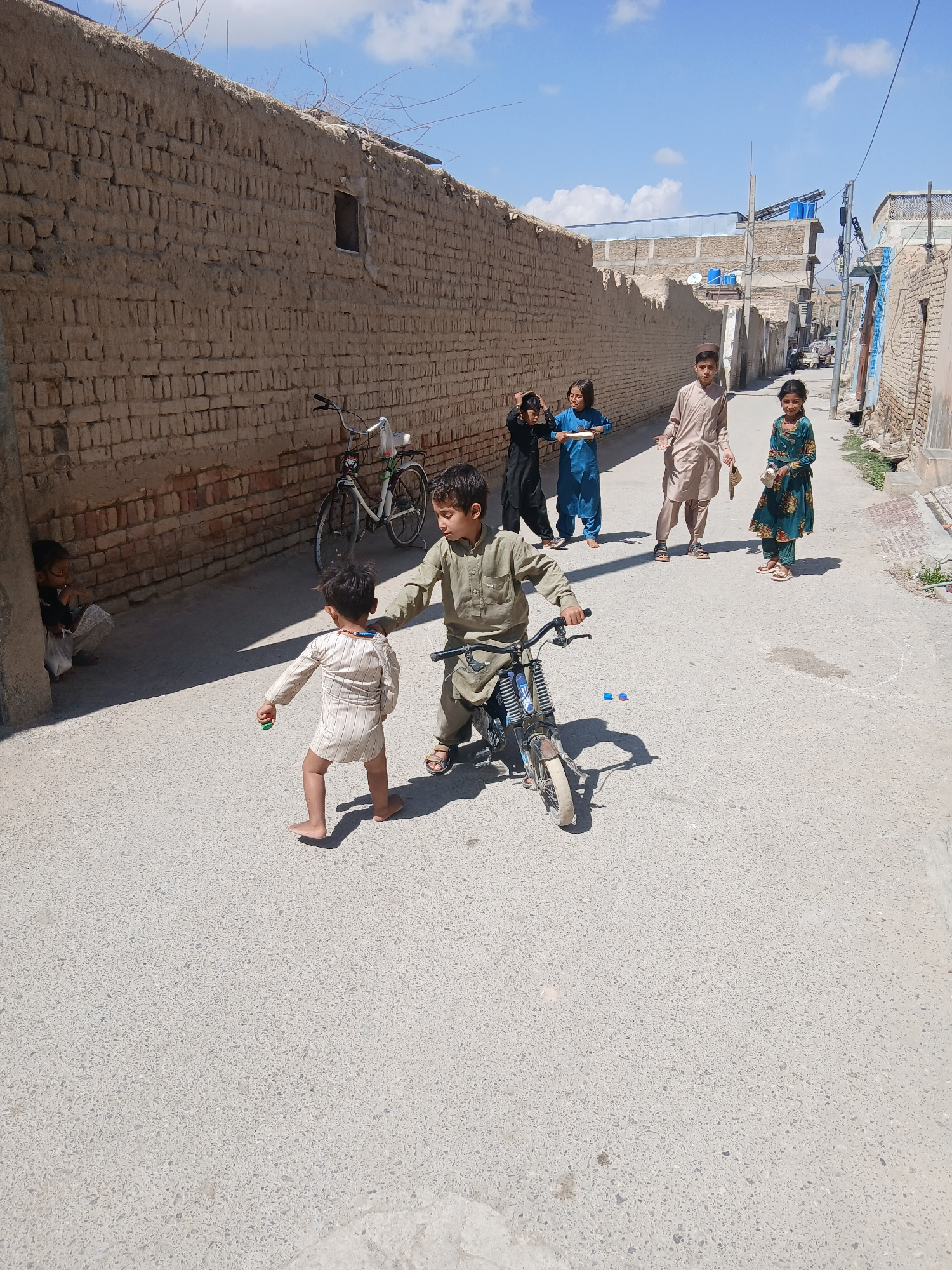 The image depicts a street scene in Quetta City Tehsil, Pakistan. A group of children is present on the road. One child is riding a small motorcycle, while another runs alongside it. Further down the…read more