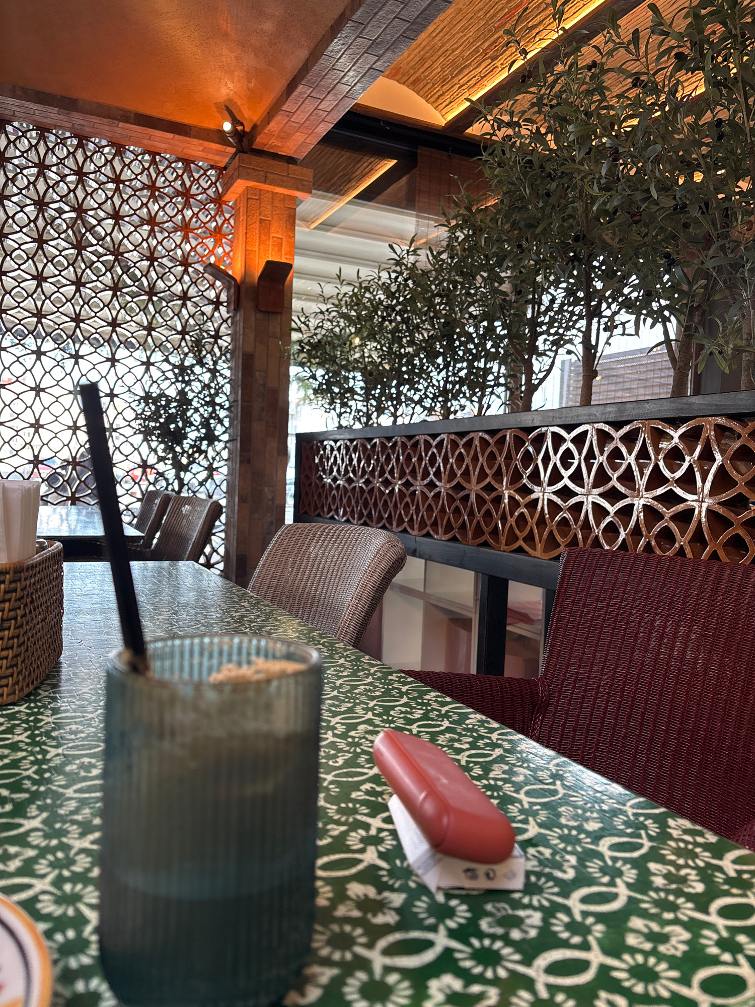 The scene is an indoor cafe, likely in Varna, Bulgaria, given the user’s specifications. The focus is on a table setting. The table is covered with a green and white floral patterned surface, and it h…read more