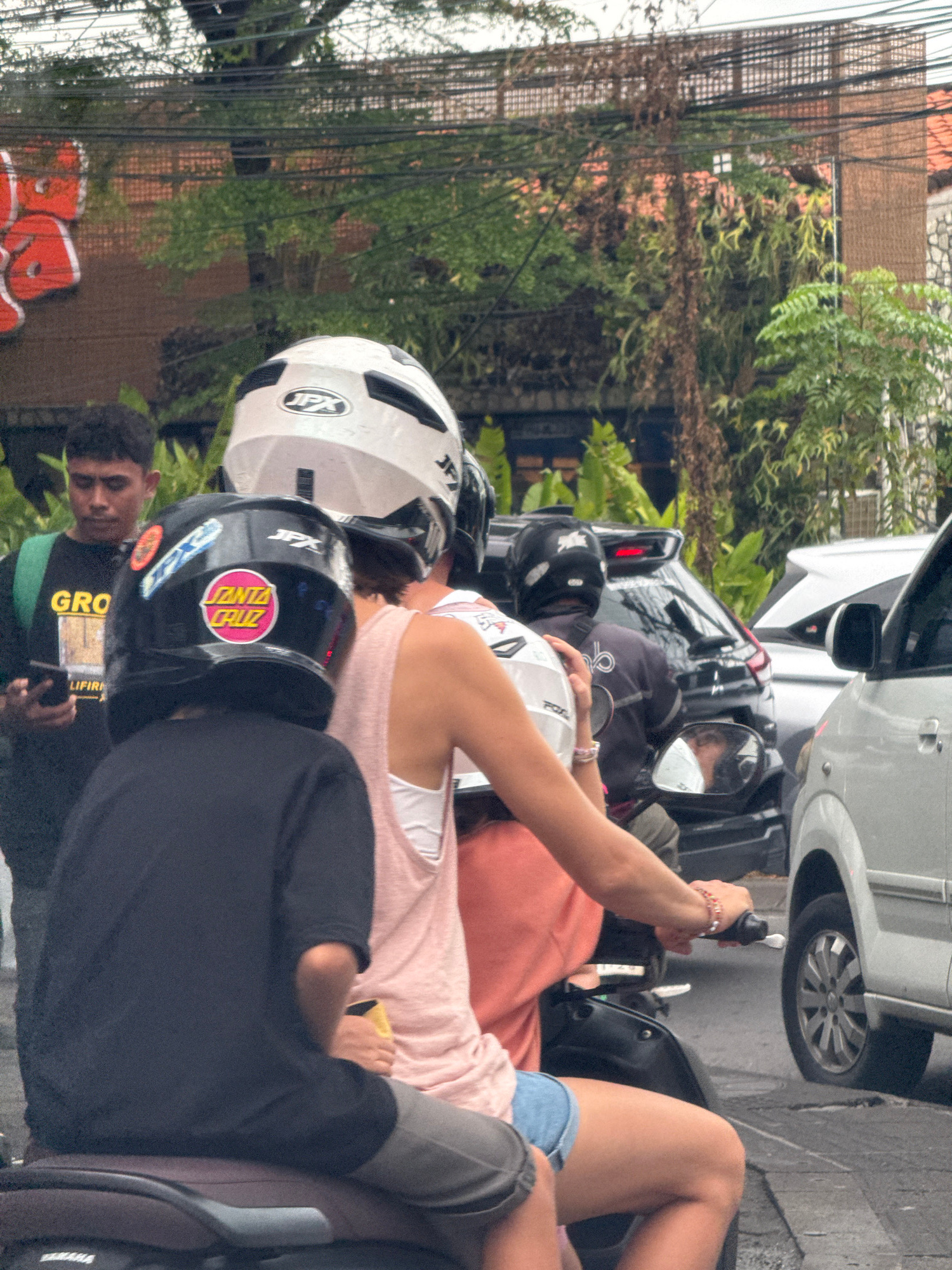 This vertical image depicts a street scene in North Kuta, Indonesia, with several people on motorcycles or scooters alongside a parked car. In the foreground, a person in a black helmet adorned with a…read more