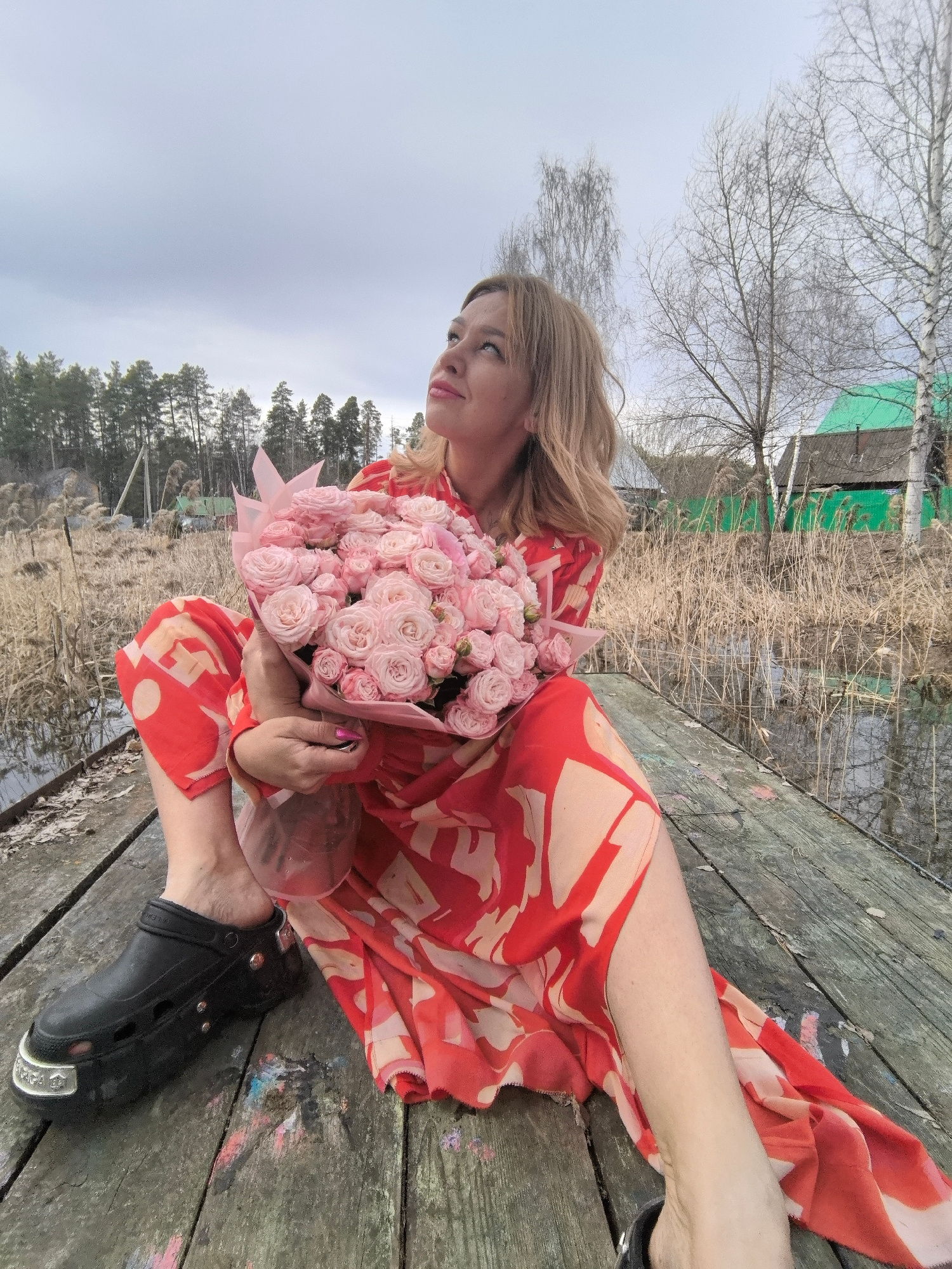 A full-length shot features a blonde woman sitting on a wooden dock, holding a bouquet of light pink roses. She is wearing a long, red and cream patterned dress and a black platform clog shoe. Her gaz…read more