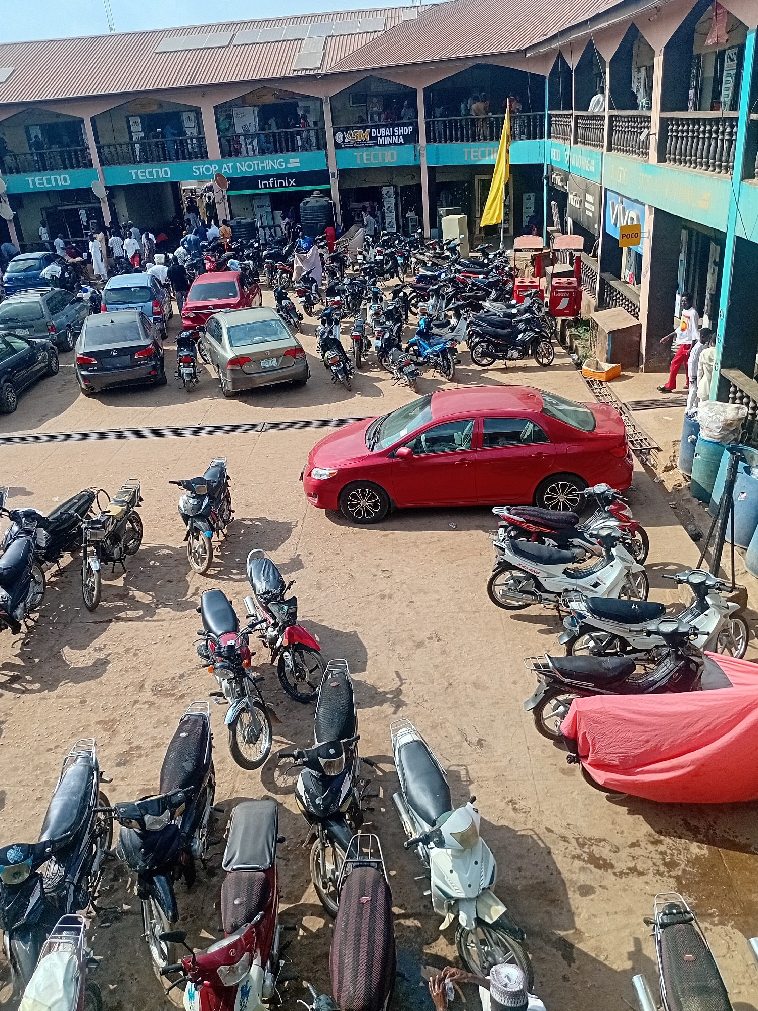 This image, captured from an elevated perspective and oriented 90 degrees clockwise from its natural upright position, depicts a bustling commercial street or market area in Minna, Nigeria, under brig…read more