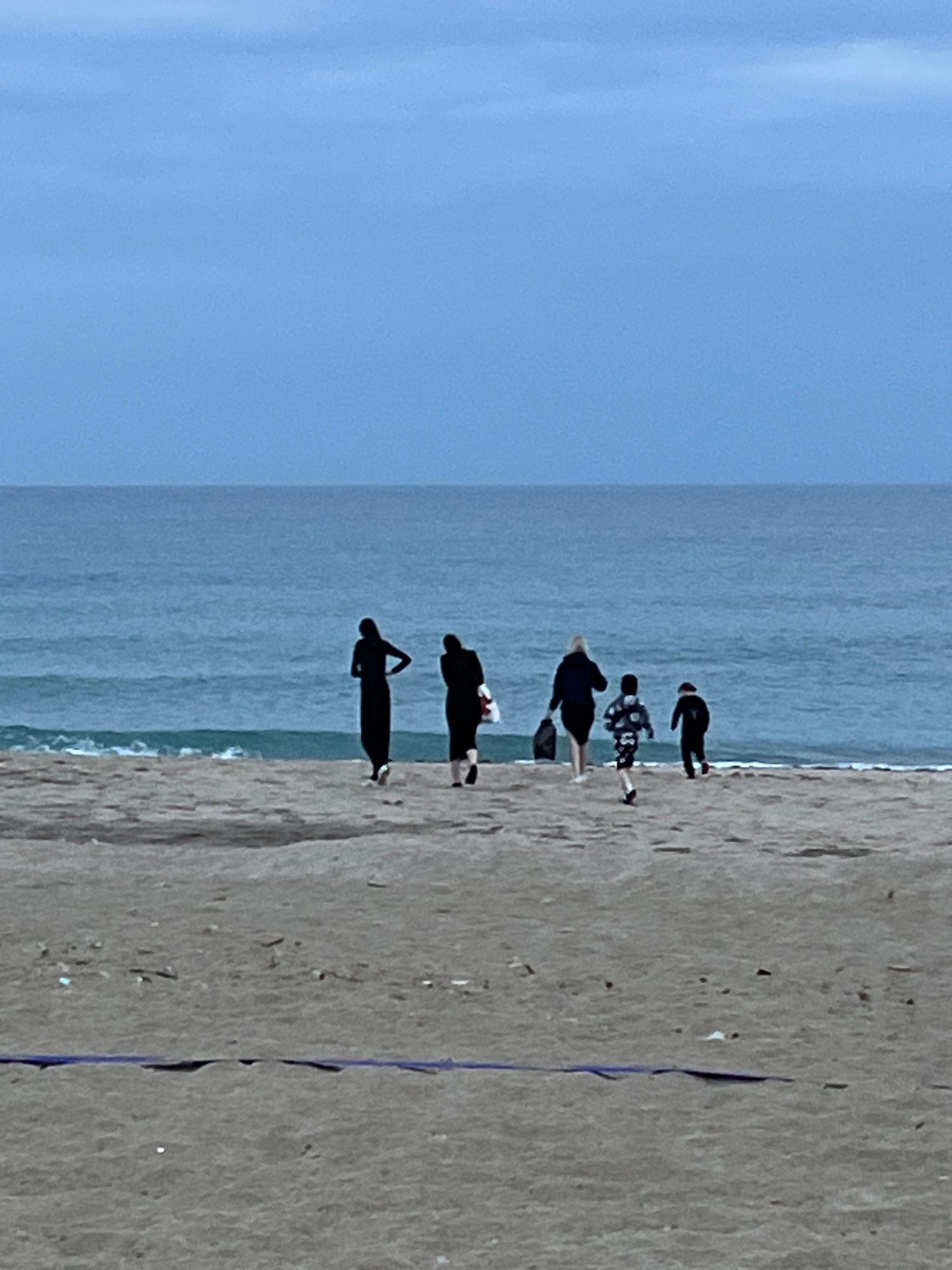 The image shows a beach scene in Alanya, Turkey. The beach is tan, and the water is a muted blue, leading to a light blue sky. Six people are on the beach, seemingly walking along the shoreline. Theyβ¦read more