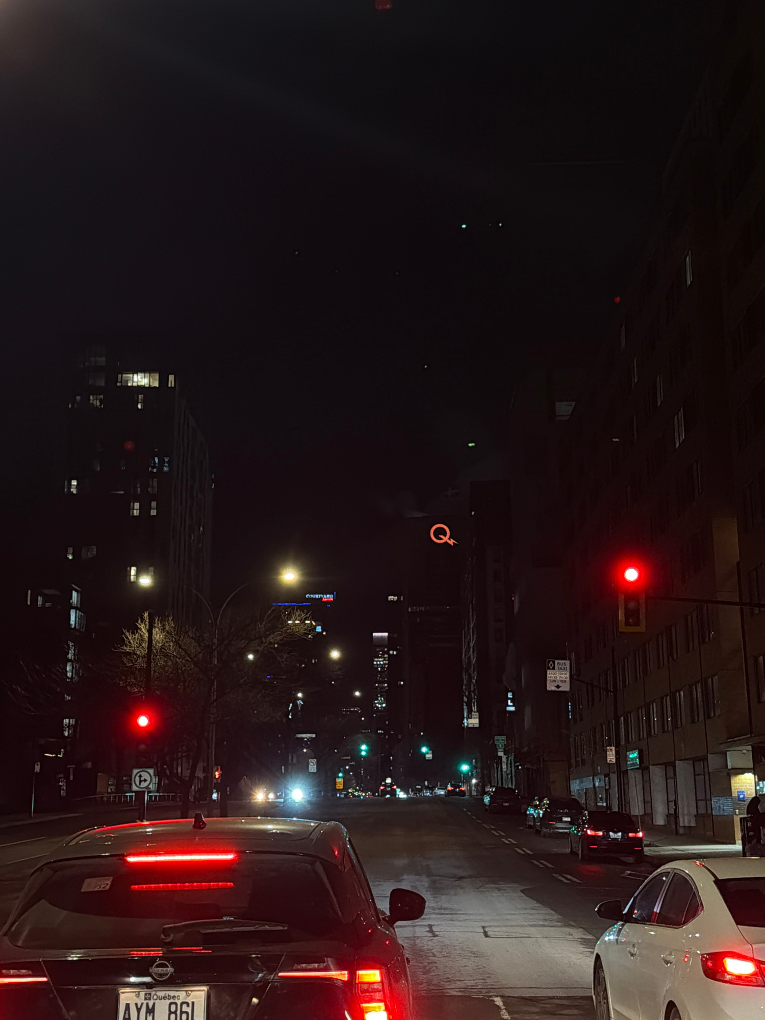 The image is a nighttime street scene in Montreal, Canada. The view is oriented up a street lined with tall buildings, with a perspective skewed due to the camera's position. Streetlights illuminate t…read more