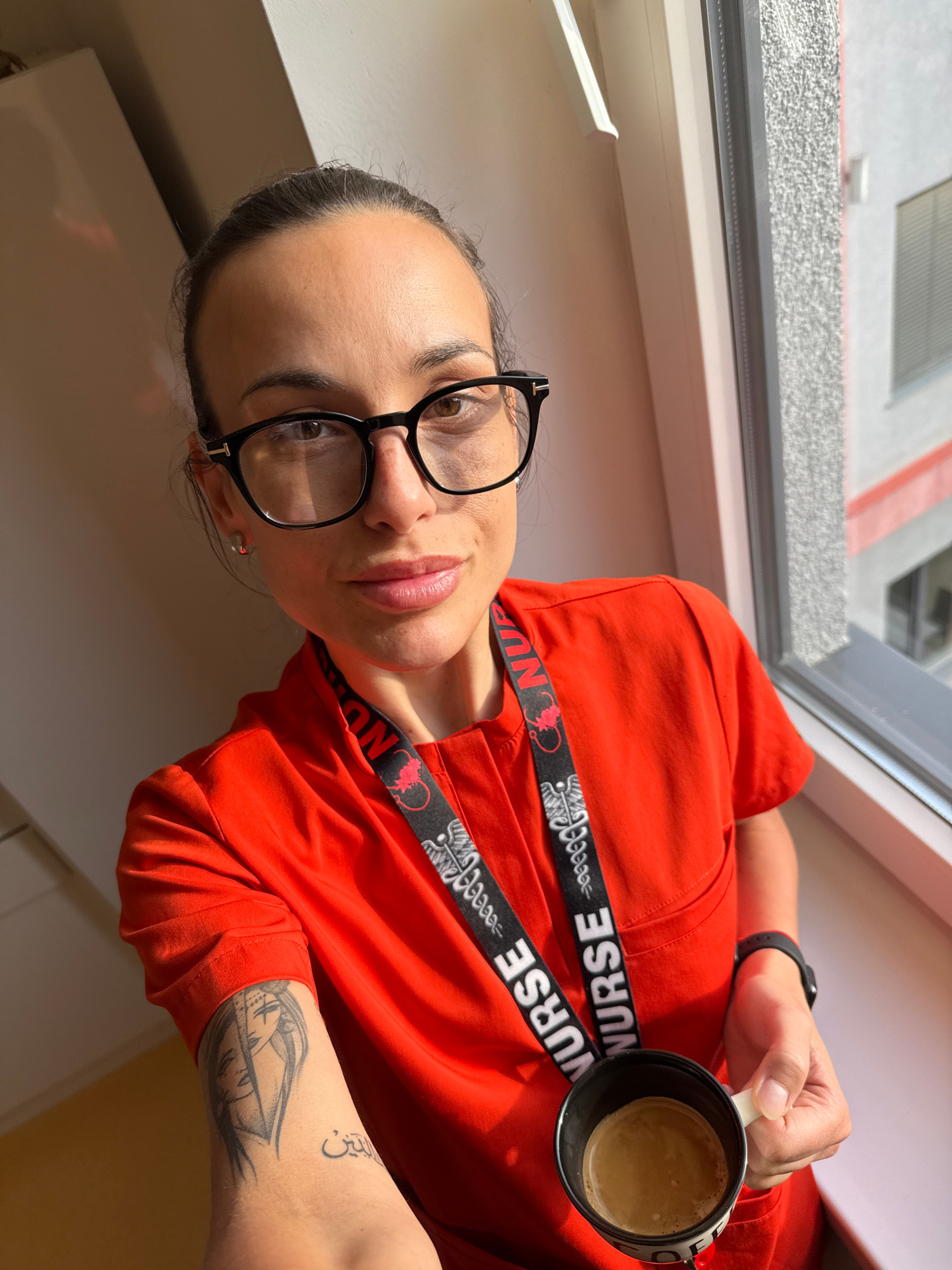 A woman with dark hair pulled back and wearing black-rimmed glasses is holding a mug of coffee near a window. She is wearing an orange top with a lanyard that says "NURSE" on it. She has tattoos on he…read more
