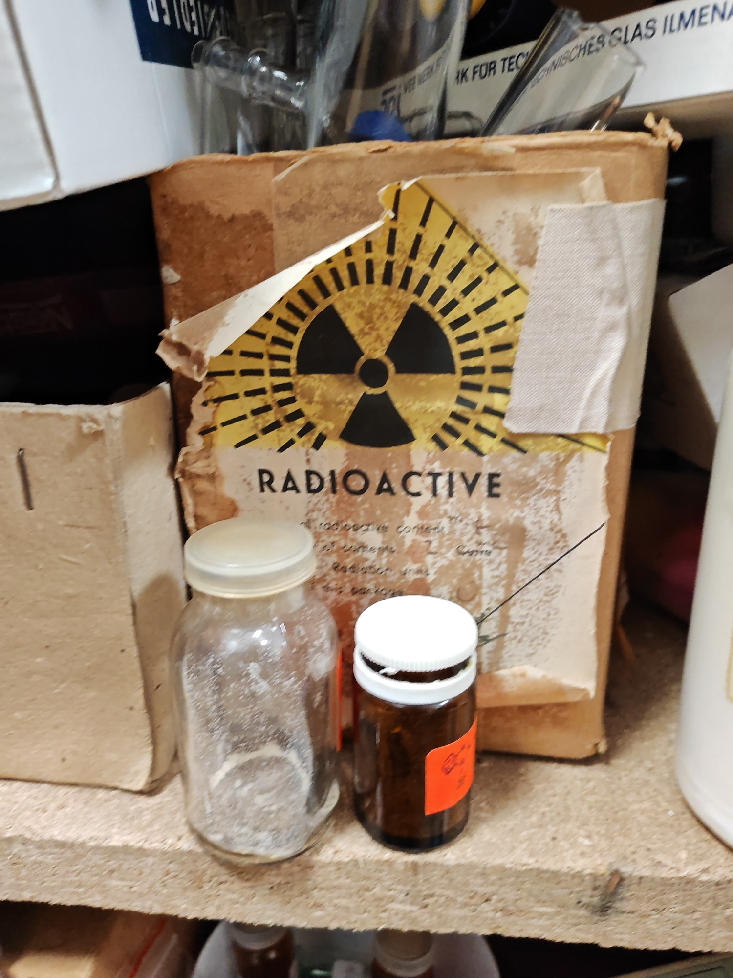 The image captures a static scene of stored items, likely within a laboratory, workshop, or storage facility. In the foreground, a prominent, worn brown cardboard box stands upright. Affixed to its si…read more