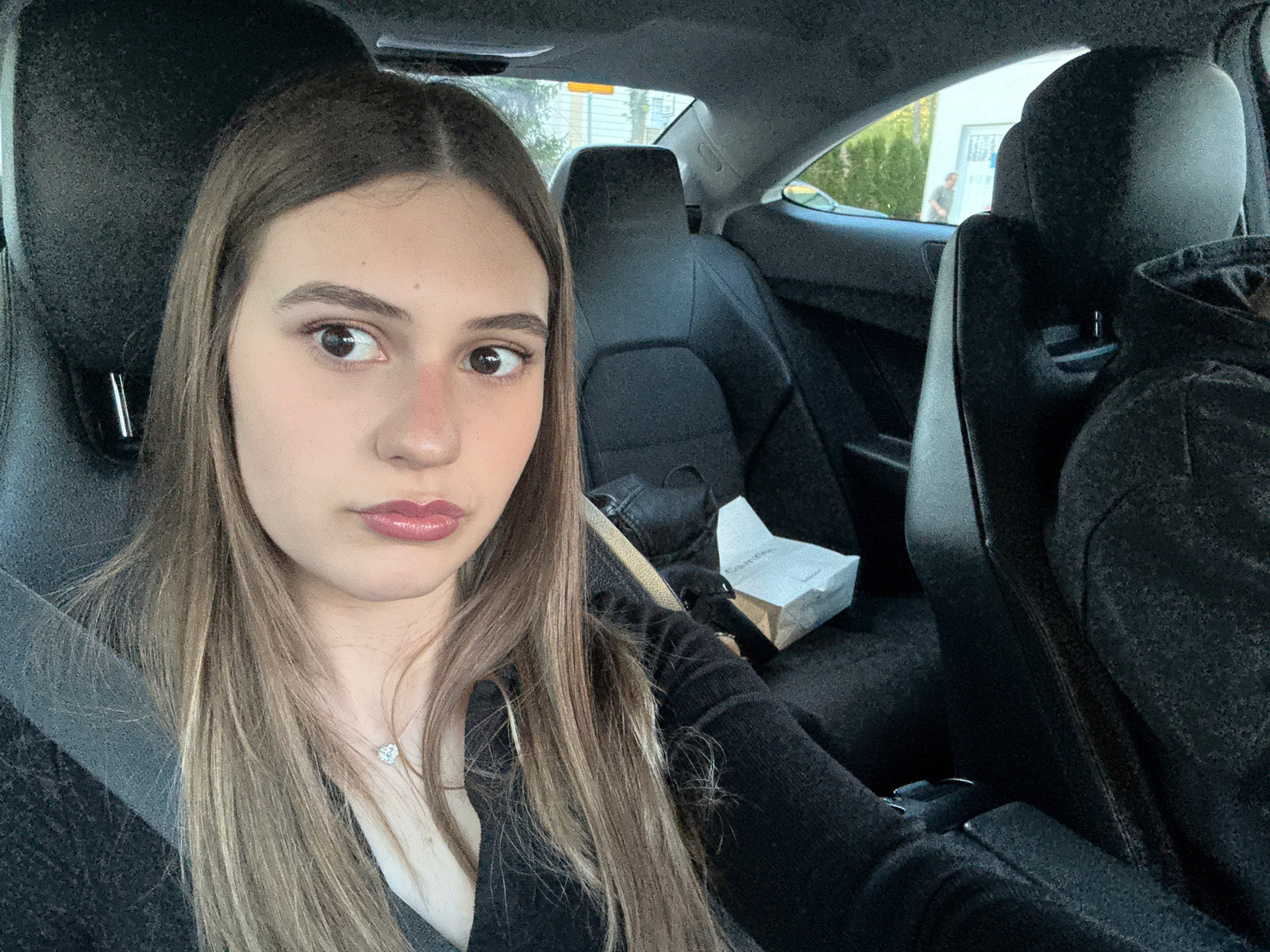 A woman is photographed from a low angle inside a car. The interior of the car is black. The woman has long, light-brown hair and is wearing a black top and a silver necklace. A white container sits iβ¦read more
