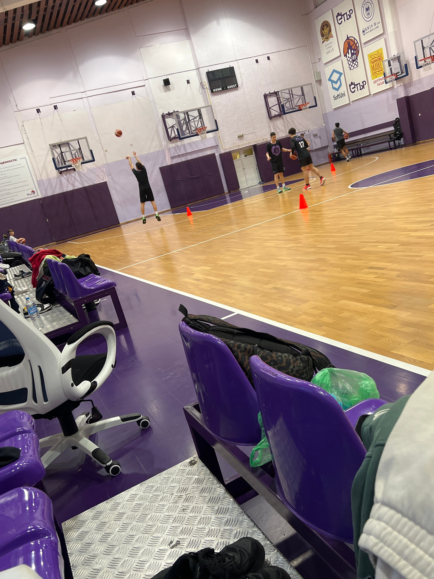 The image shows a basketball practice in a gymnasium with purple walls and spectator seating. Several players are visible on the court, engaged in drills that involve basketballs and orange cones. The…read more
