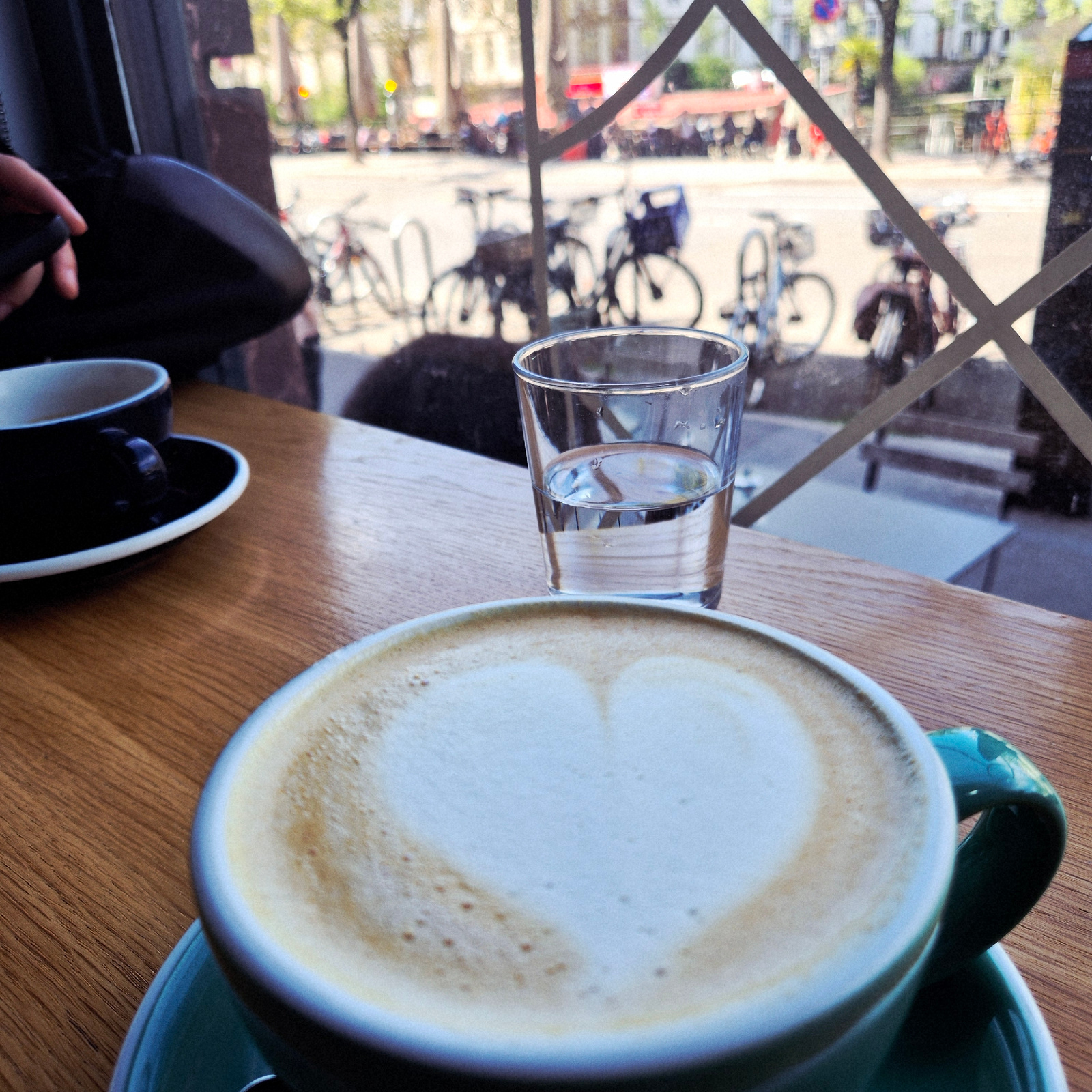 The scene depicts a wooden table with a turquoise cup of coffee and a glass of water next to it. Another cup of black coffee and a purse are also on the table. A street scene is visible through a windβ¦read more