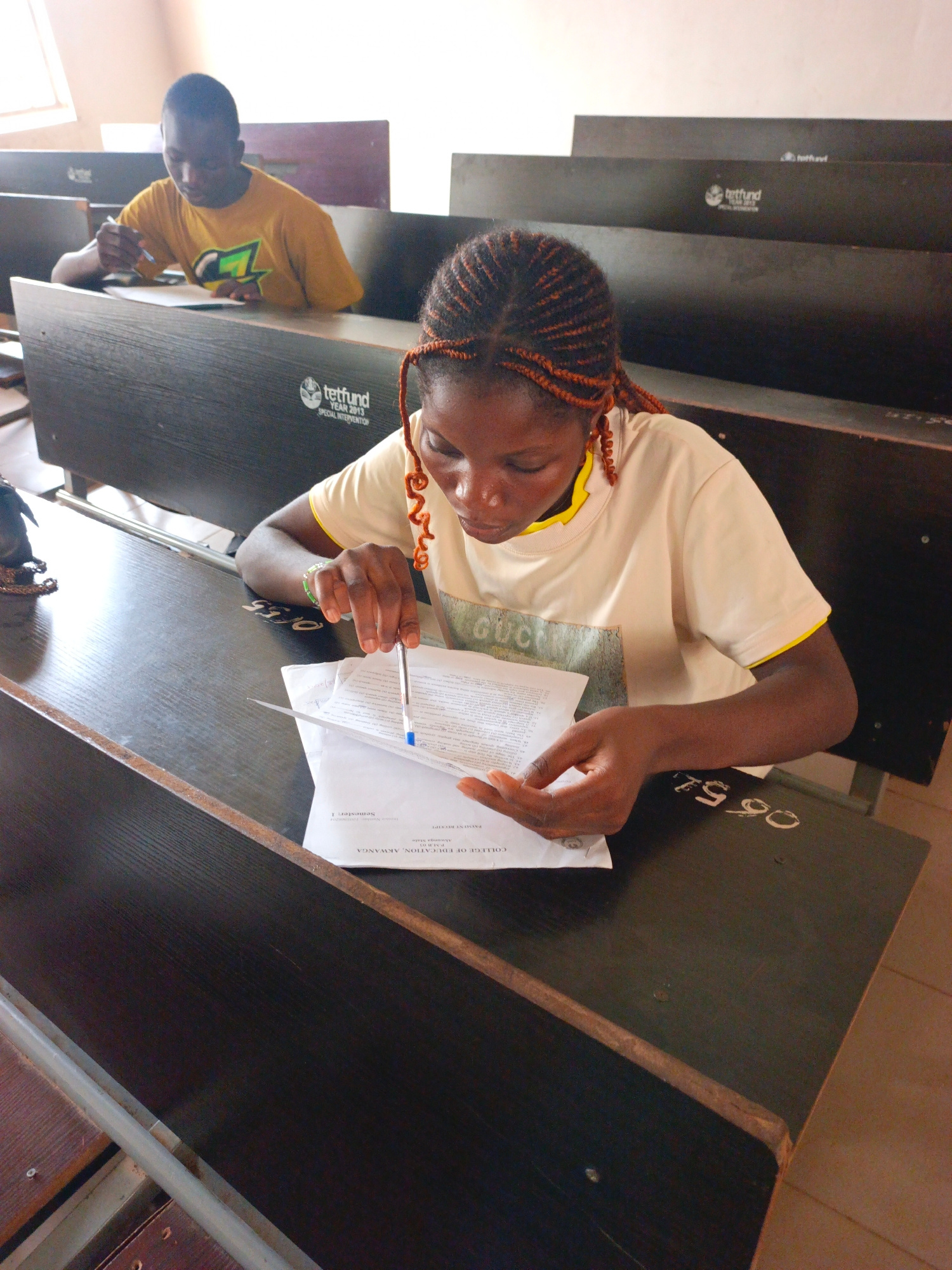 The image shows two people, presumably students, seated at desks in what appears to be a lecture hall or classroom. The scene takes place at the College of Education, Akwanga, Akwanga State, Nigeria.…read more