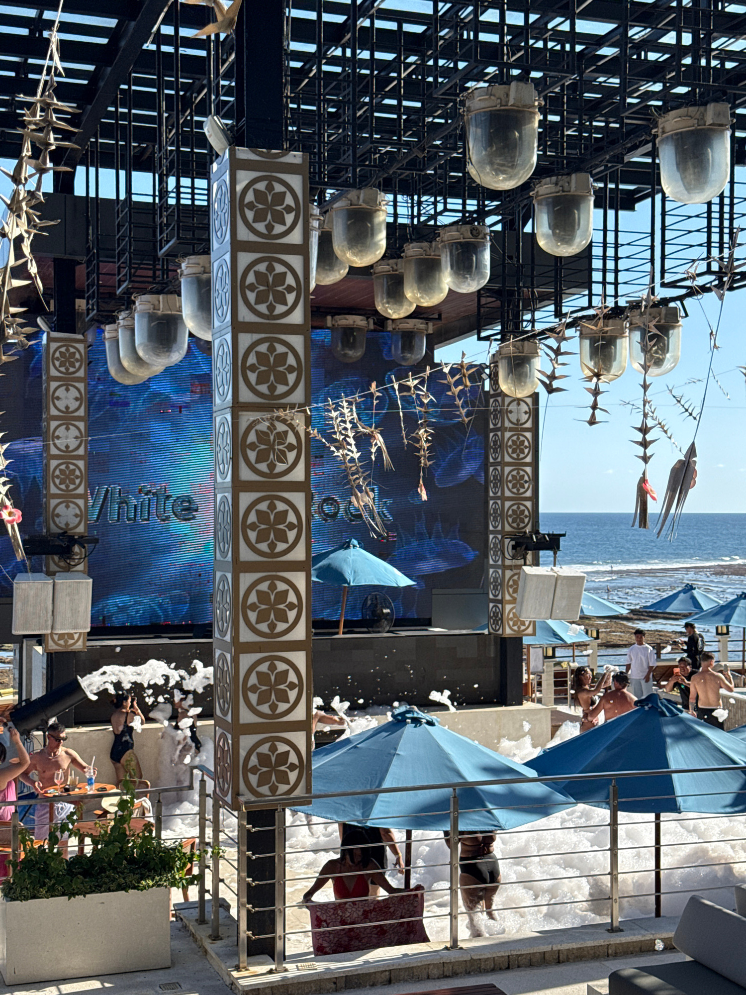 The image shows a foam party at a beach club in Kuta Selatan, Indonesia. Patrons relax under blue umbrellas with artificial foam blanketing the scene. In the background, there is the ocean and sky. Inβ¦read more