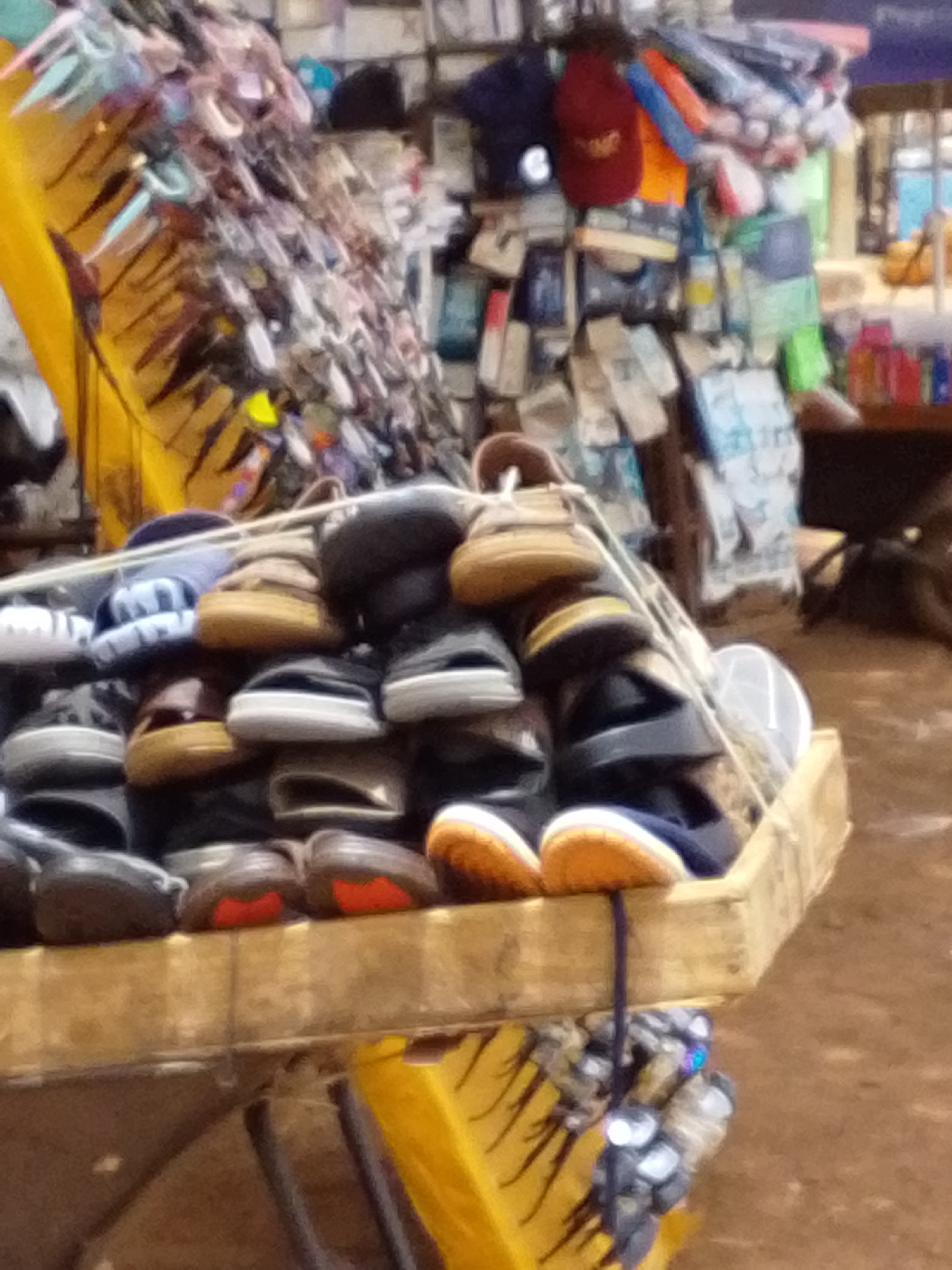 The image depicts a roadside vendor's stall in Tamale, Ghana. The stall is a wooden crate filled with an assortment of sandals and slippers. A display of sunglasses hangs behind the sandals, along wit…read more