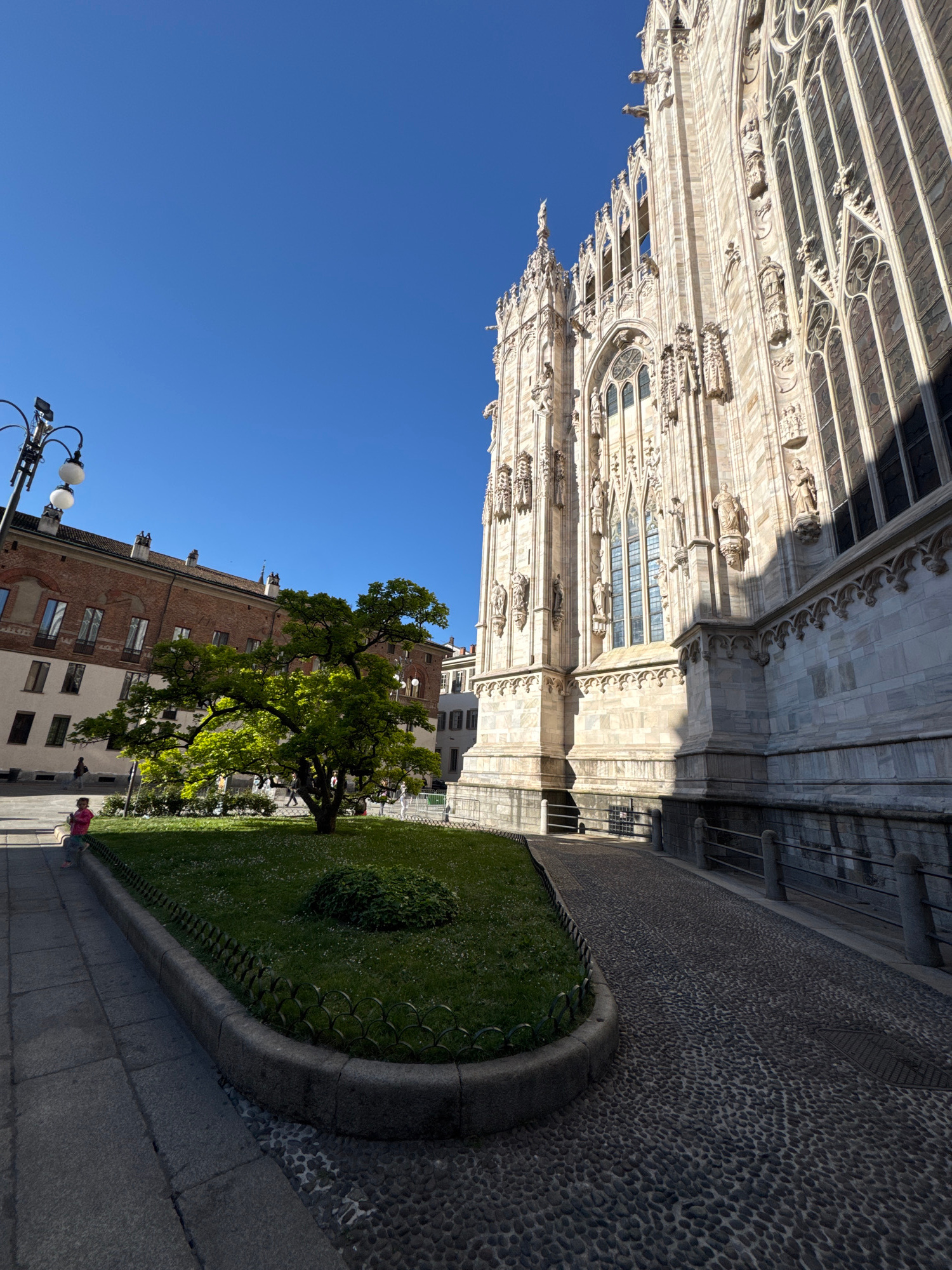 Here's a description of the image: The image shows a view in Milan, Italy, with the Duomo di Milano visible in the upper part of the frame. The photograph is taken from a low angle. The Duomo is part…read more
