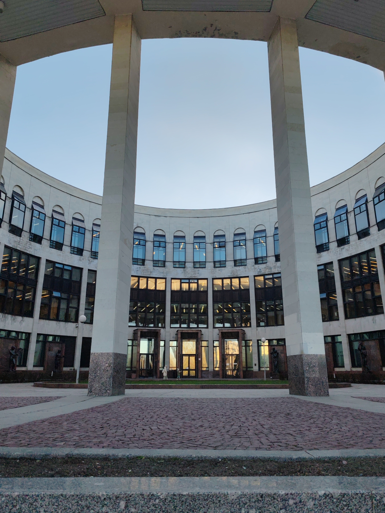 The image presents a low-angle, eye-level view of an architectural structure located in Saint Petersburg, Russia. The building features a curved, multi-story façade with arched windows and prominent s…read more