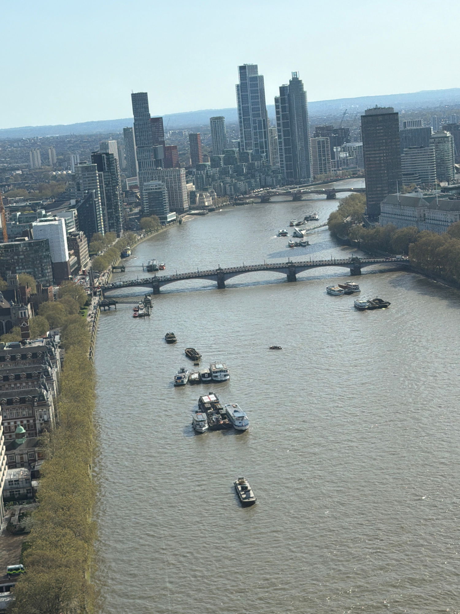 The image shows an elevated view of the River Thames in London, United Kingdom. A bridge with multiple arches spans the river, connecting the cityscape on both sides. Numerous boats and other watercra…read more