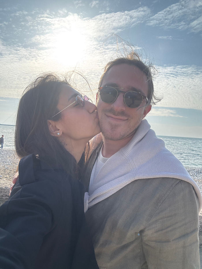 A close-up, backlit photograph depicts two individuals on a pebbly beach in Šušanj, Montenegro. The female subject, positioned on the left, has long dark hair, wears sunglasses with pink-tinted lenses…read more
