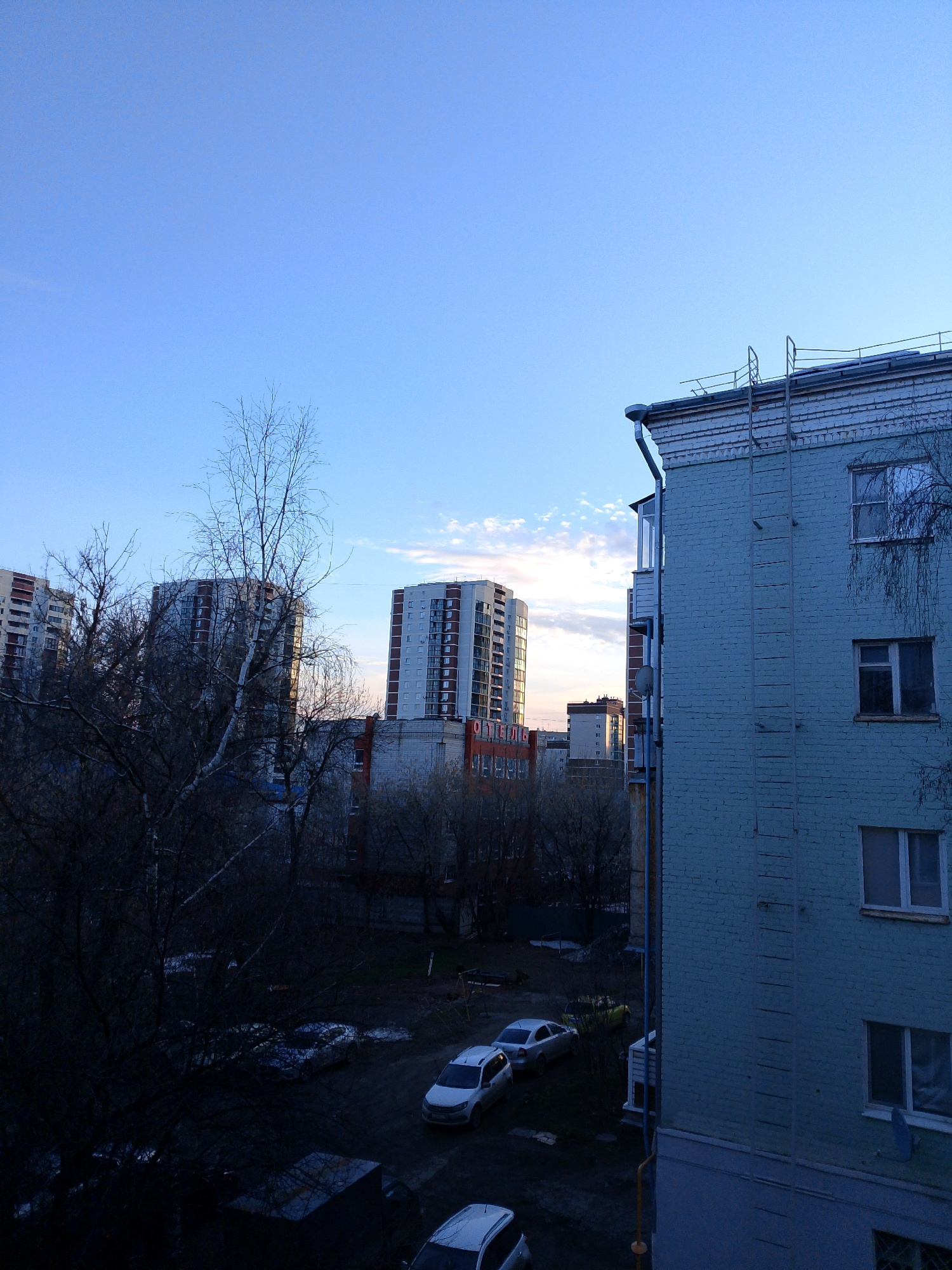 The image shows a view from a high vantage point in Izhevsk, Russia, capturing a residential area at what appears to be dusk. In the foreground is a light-blue brick building with a fire escape ladderβ¦read more