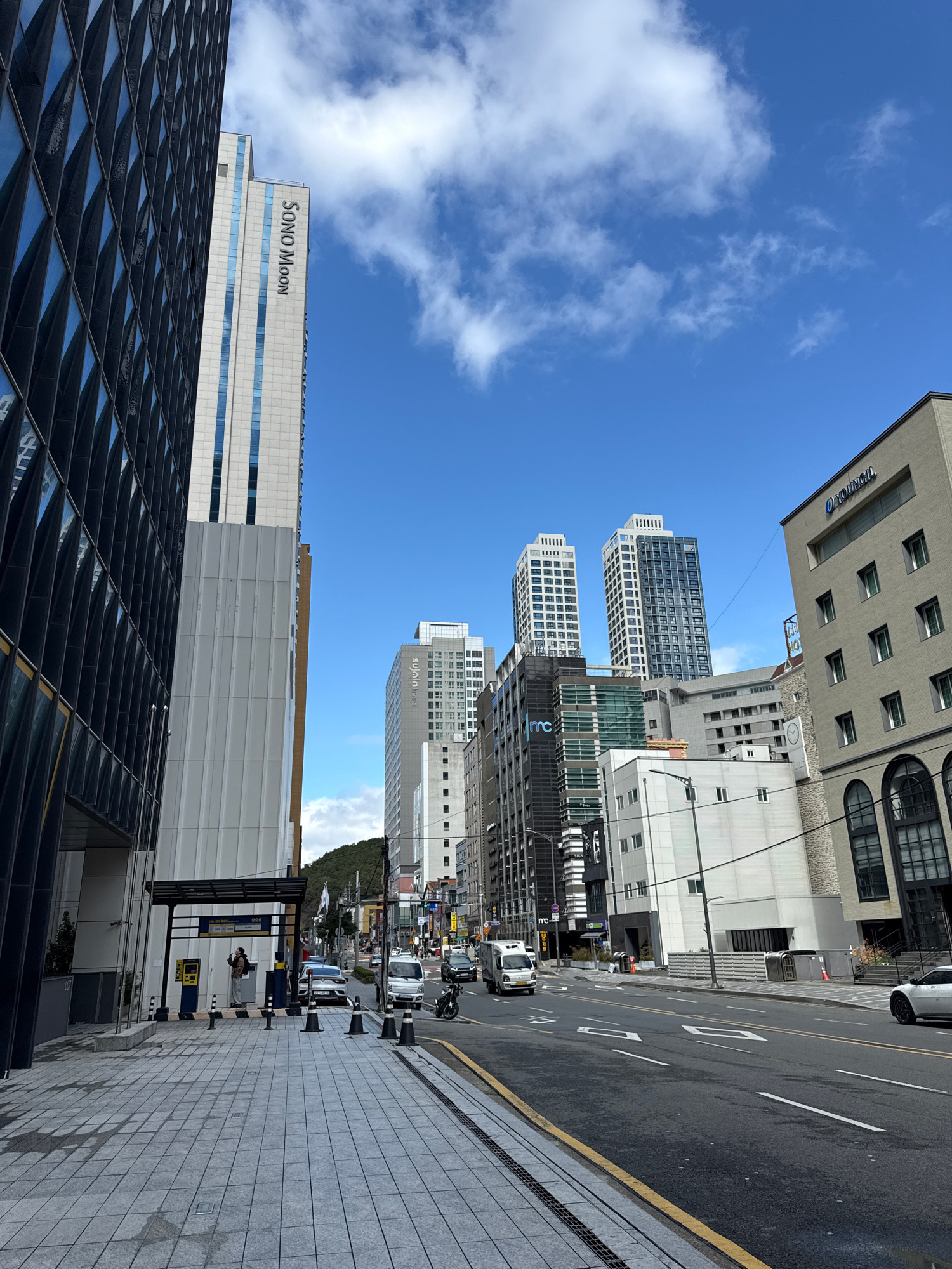 The photograph shows an urban street scene in Busan, South Korea. A row of buildings of various heights and architectural styles line the street. "SONO MOON" is visible on the upper portion of a large…read more