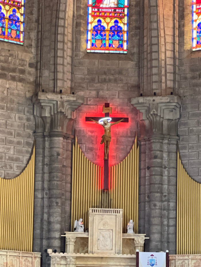 The image depicts the interior of Nha Trang Cathedral (also known as the Stone Church) in Nha Trang, Vietnam, specifically focusing on the main altar area. Dominating the center is a large crucifix fe…read more