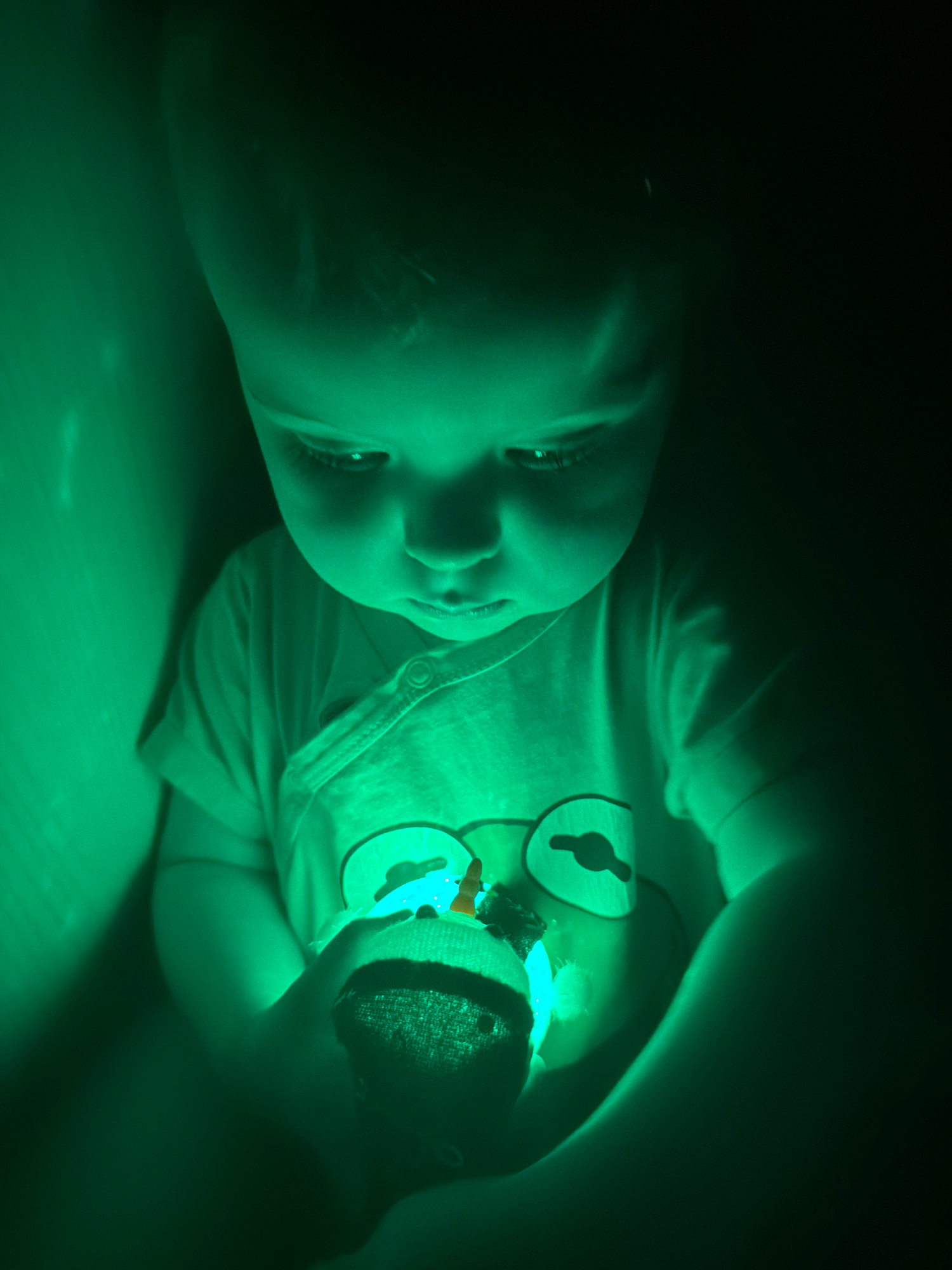 A child is lying on their back in near darkness, with their face angled towards the left and lit by a soft green glow. The child is wearing a light-colored shirt with button details. The shirt feature…read more