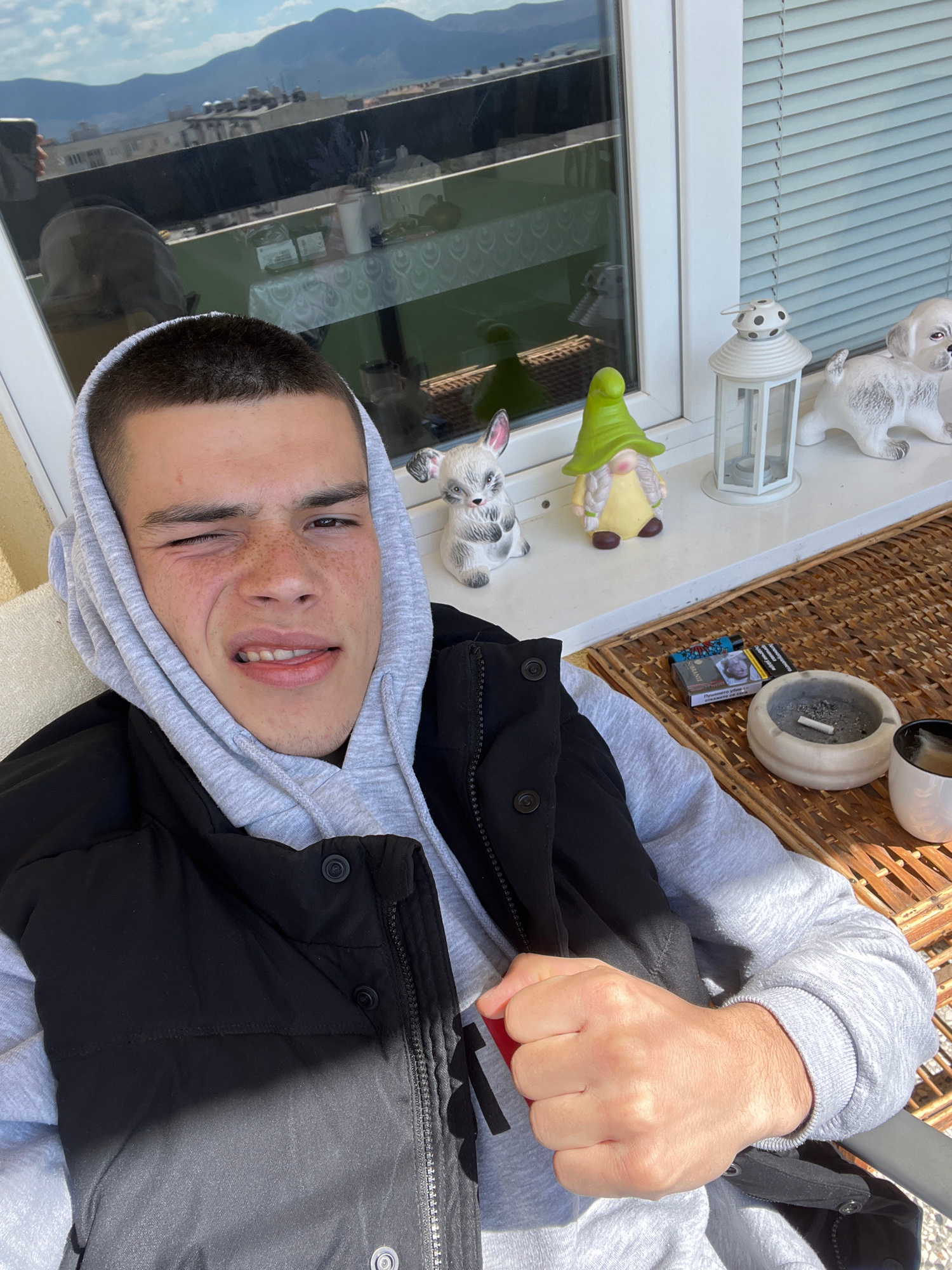 A young man wearing a grey hooded sweatshirt under a black jacket is lying down outside. He's winking and smiling. Beside him is a woven wicker surface with a white ceramic ashtray containing a cigare…read more